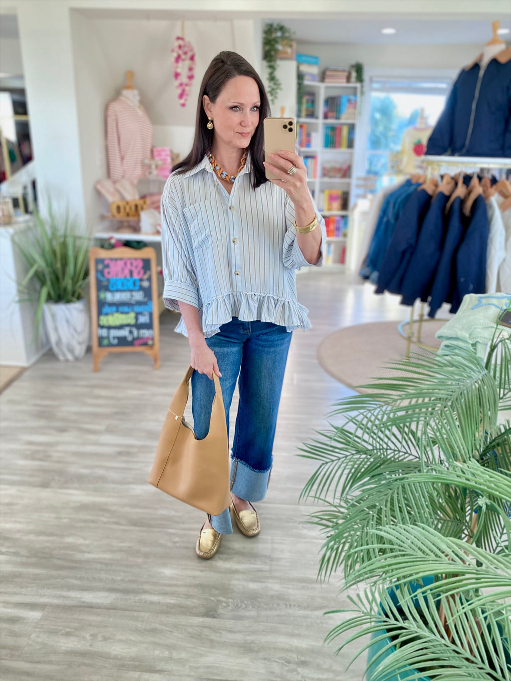 Stripe Elbow Sleeve Ruffle Hem Shirt