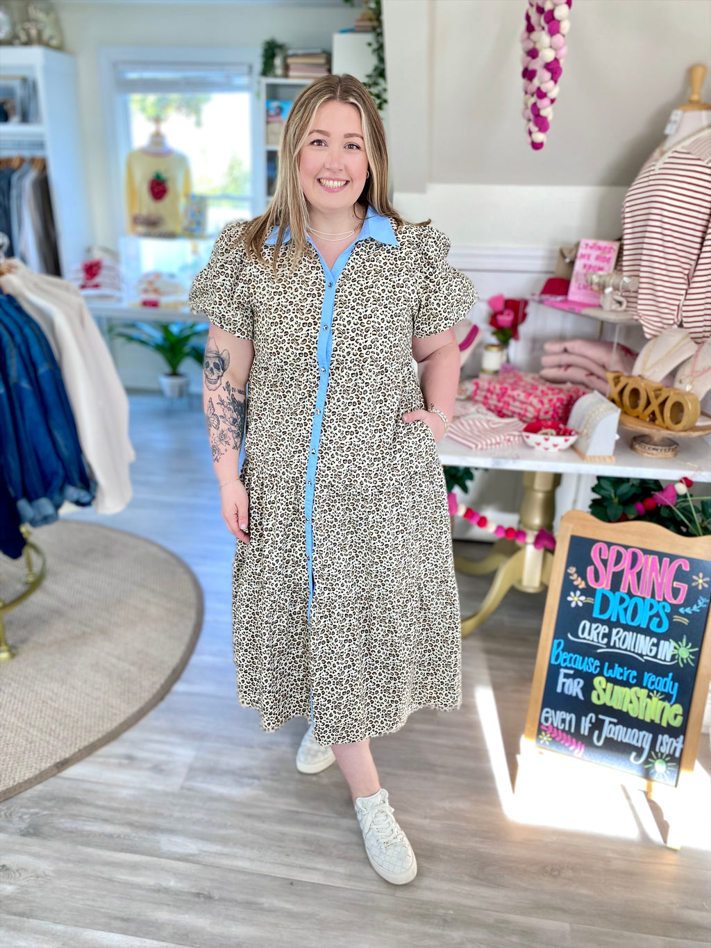 Animal Print Puff Sleeve Button Down Midi Dress