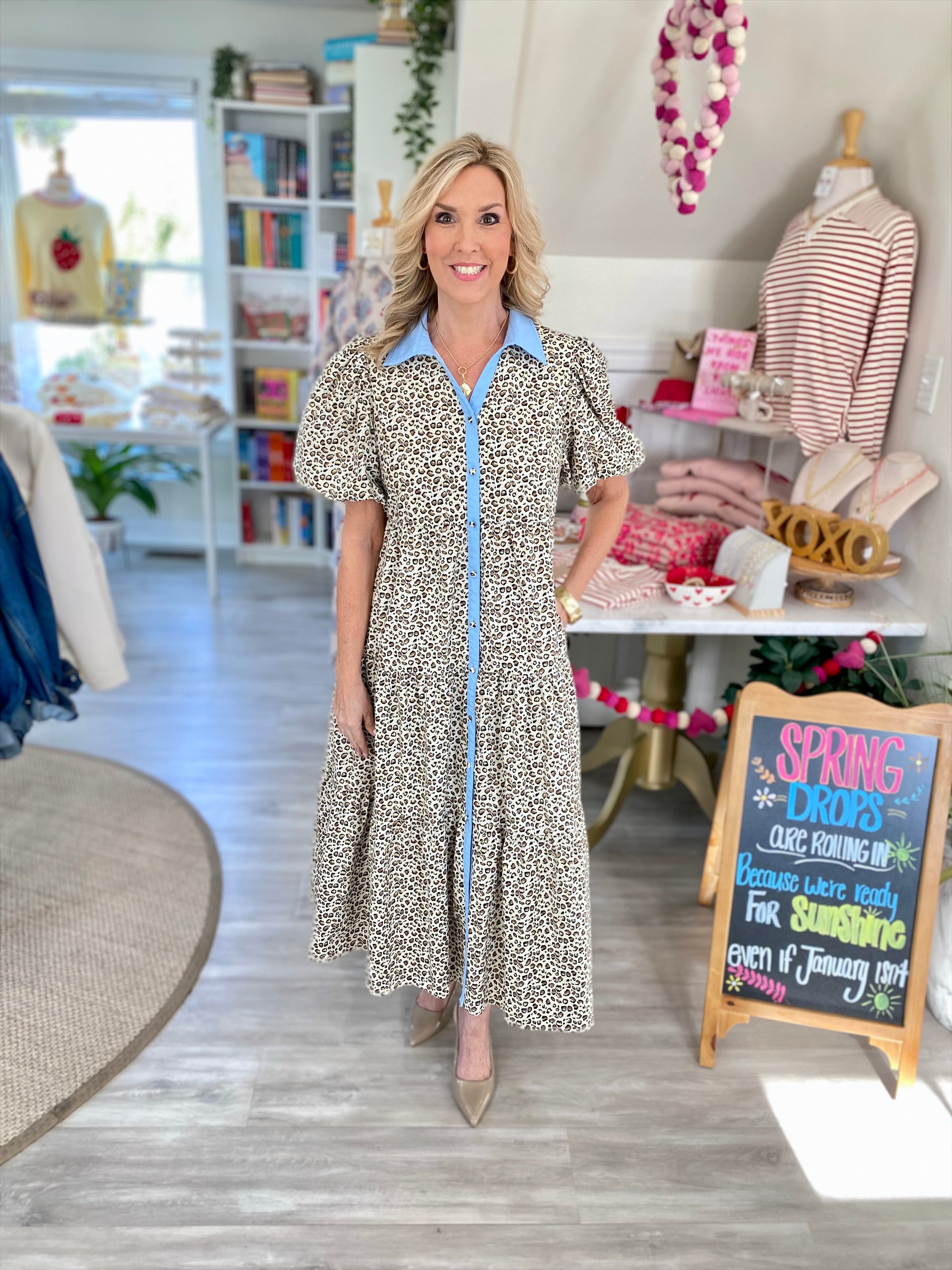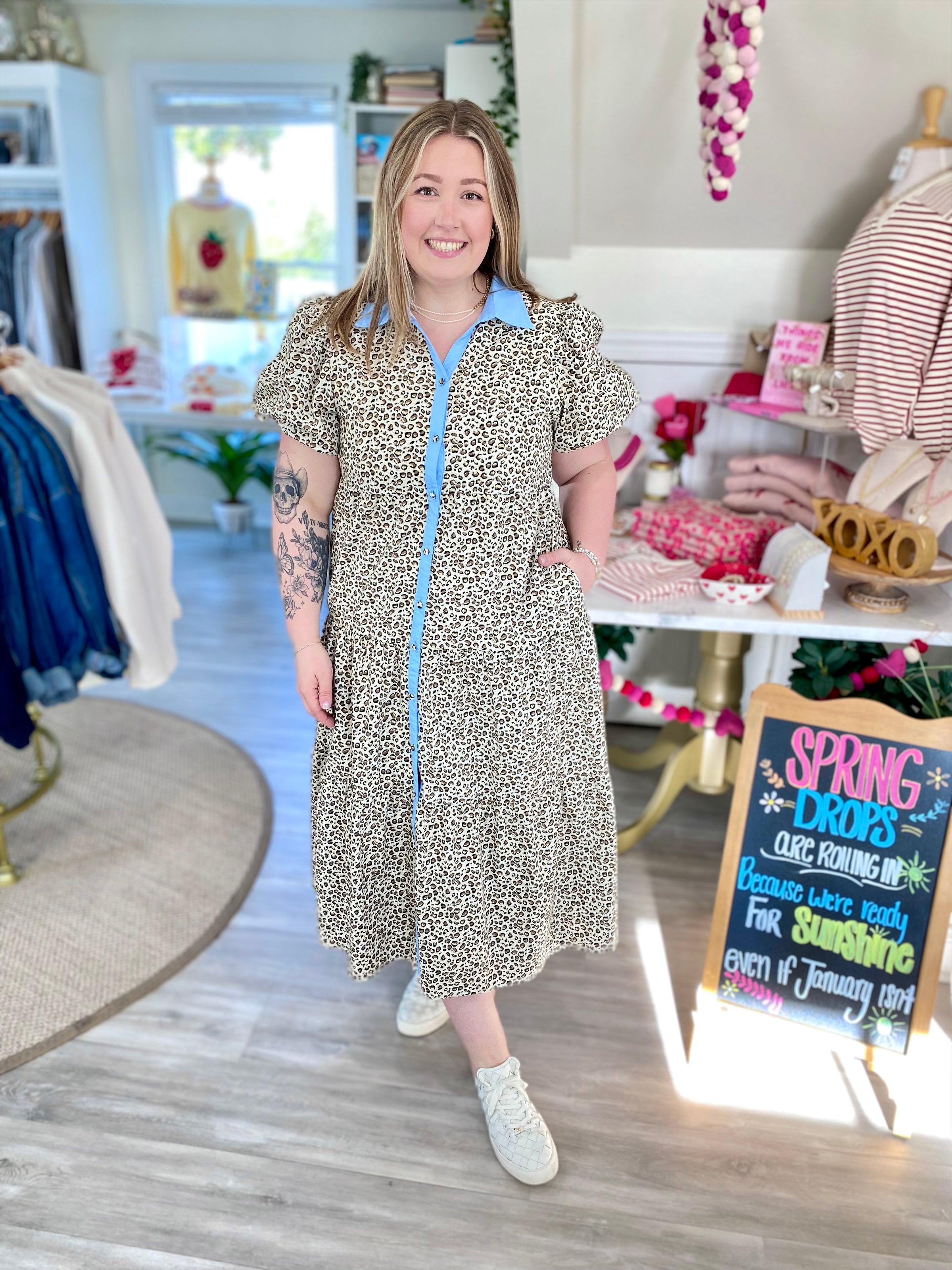 Effortlessly chic with a touch of playful charm, this leopard print midi dress is designed to stand out while staying easy to wear. Featuring short puff sleeves and a classic button-down front, it offers a flattering silhouette with timeless appeal. The tiered skirt adds soft movement, while side pockets bring everyday practicality you’ll love. Finished with solid contrast accents for an elevated boutique touch, this dress transitions beautifully from daytime outings to casual evenings.