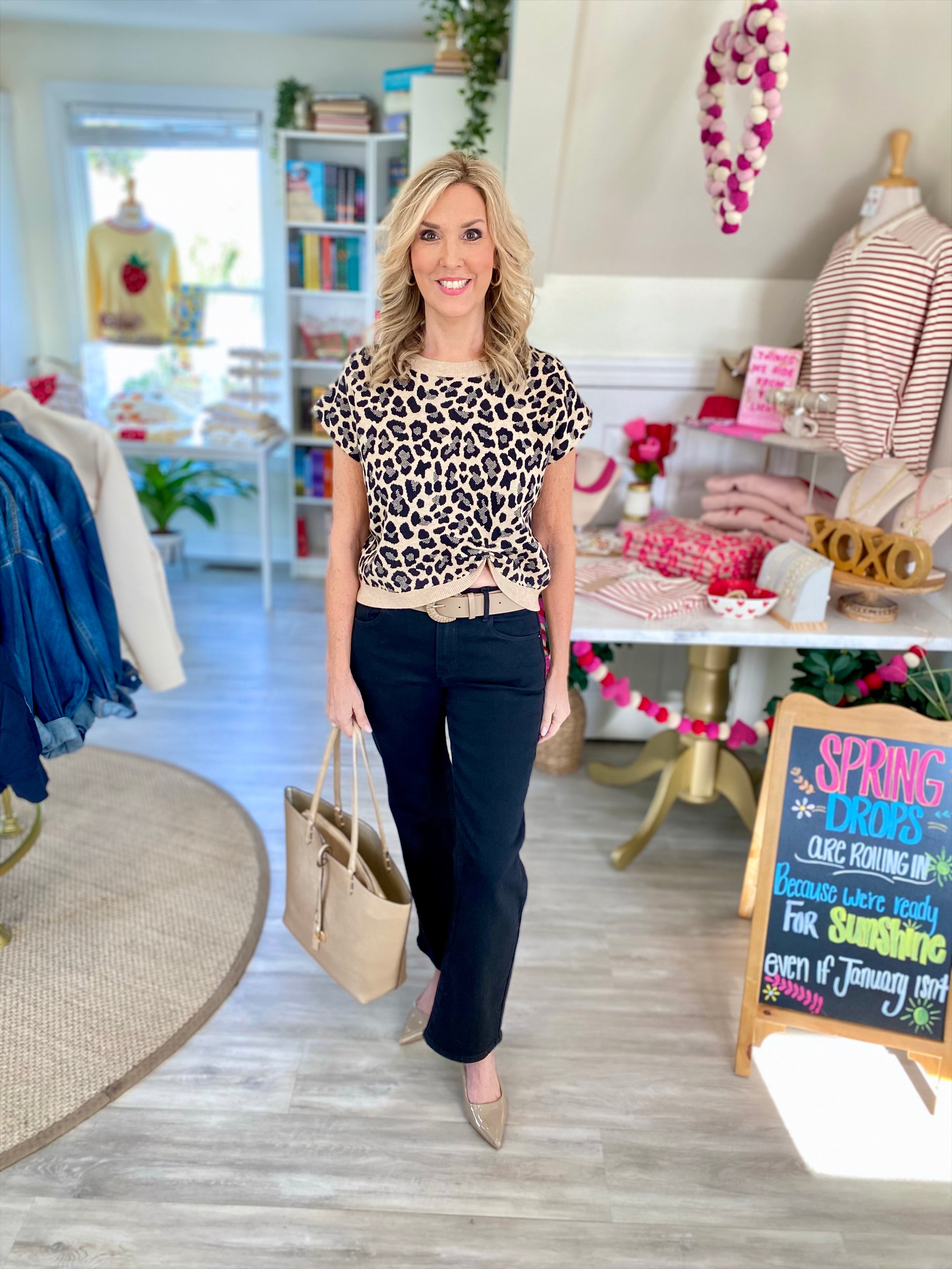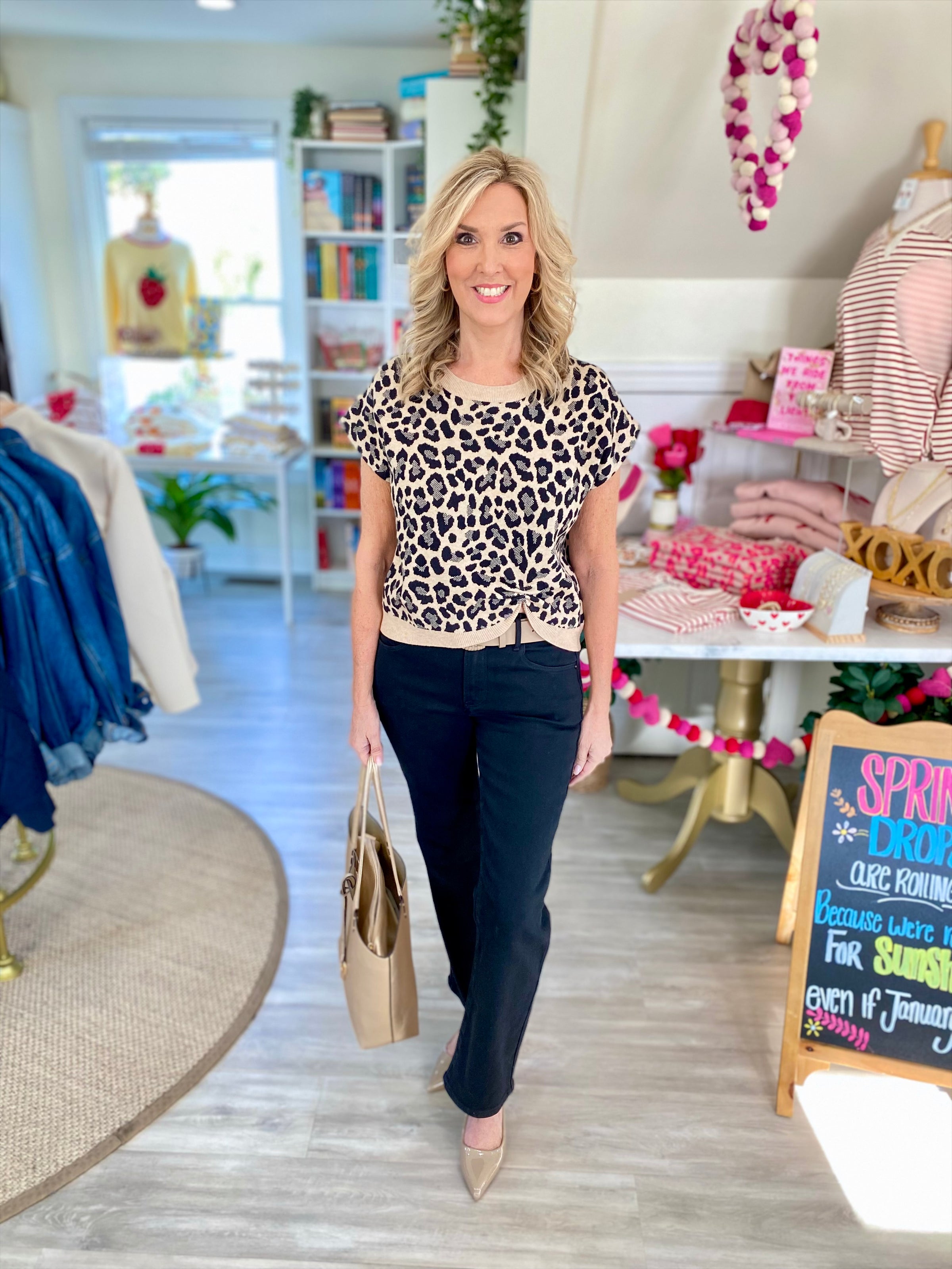 This chic leopard sweater top blends cozy comfort with effortless style. Featuring a drop shoulder silhouette for a relaxed fit, it’s finished with a front knot detail that adds a flattering, modern twist. The soft sweater knit makes it easy to wear while the bold leopard pattern delivers just the right amount of statement.