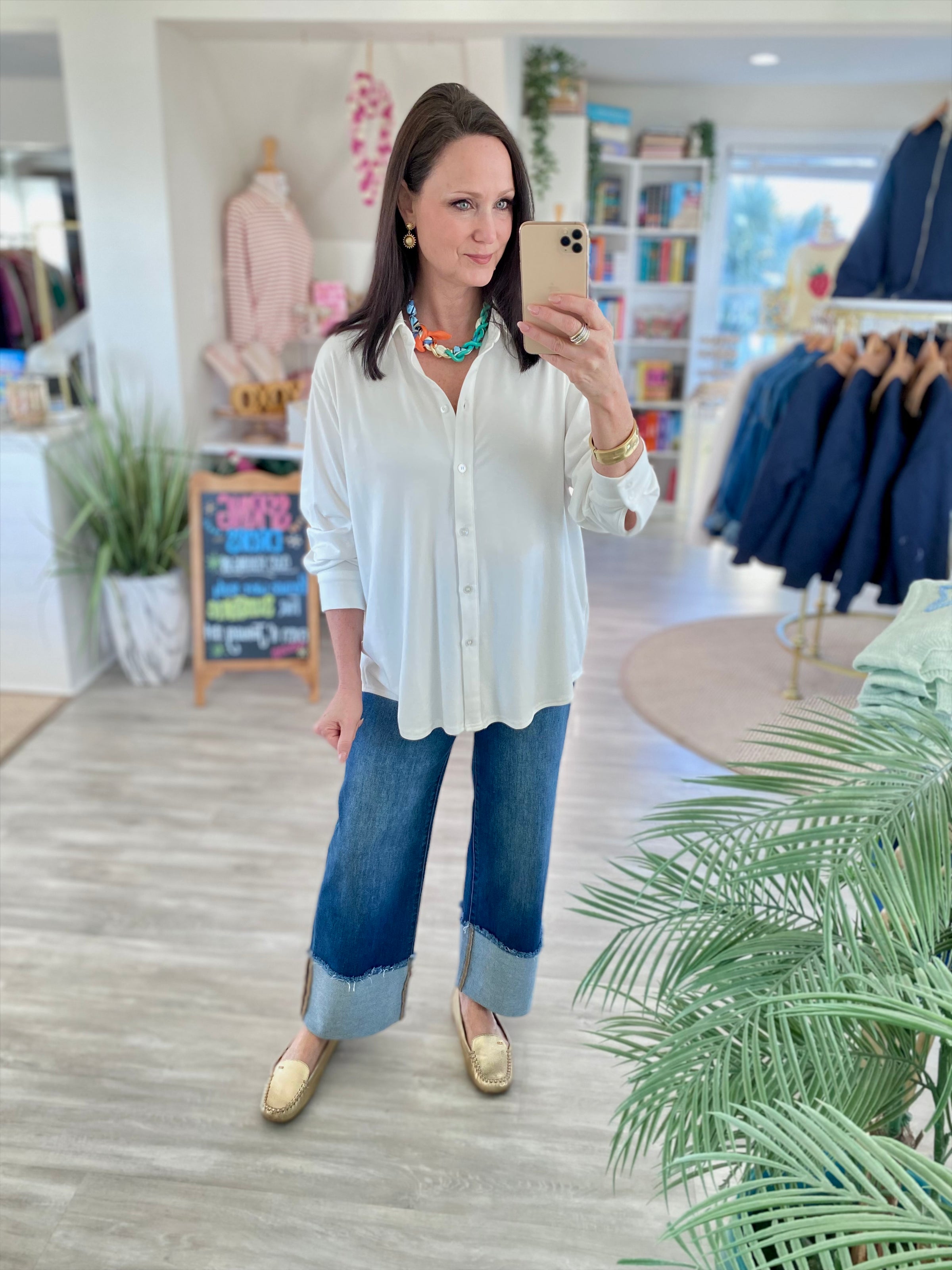This elevated basic is the perfect blend of comfort and polish. Crafted in a soft jersey fabric, it drapes effortlessly while maintaining a clean, classic look. Easy to wear tucked, half-tucked, or open as a lightweight layer, this button-down is a versatile must-have for everyday styling.