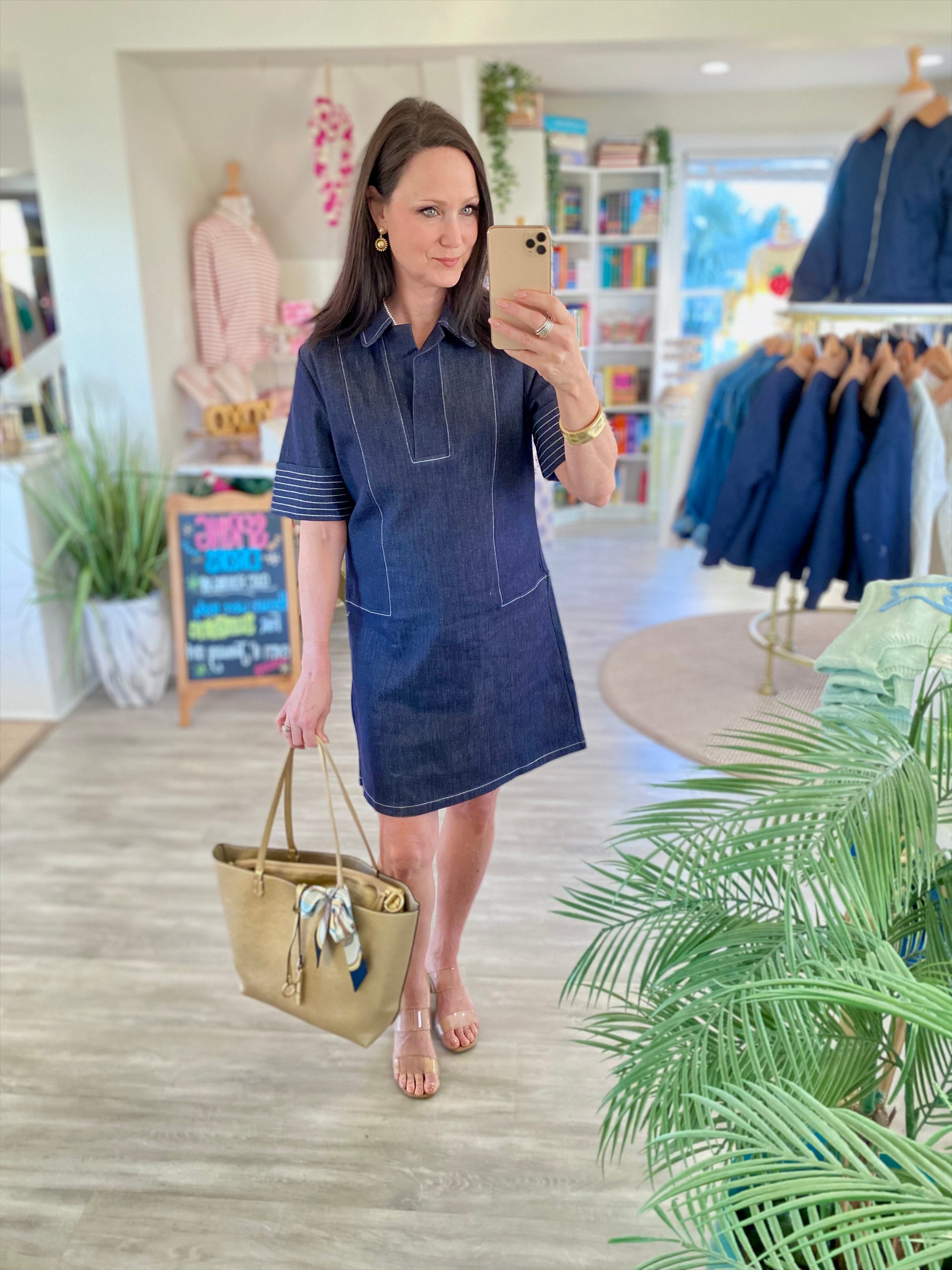 This easy denim mini dress blends casual comfort with a polished finish. Designed with a classic collar, split neckline, and contrast stitching throughout, it features rolled short sleeves and a relaxed silhouette for everyday wear. An effortless go-to for workdays, weekends, or casual outings.
