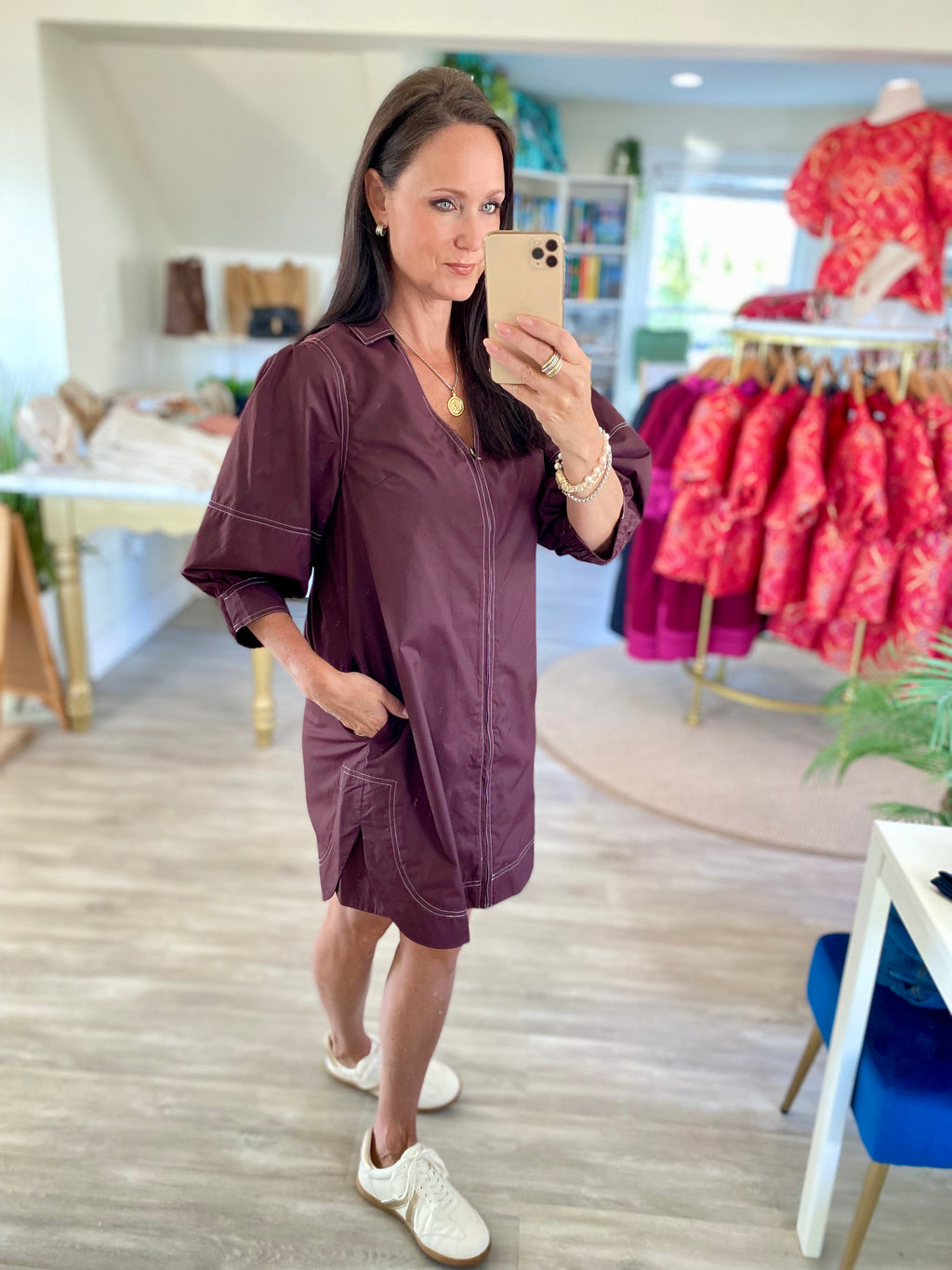 3/4 Lantern Sleeve Zipper Front Mini Dress