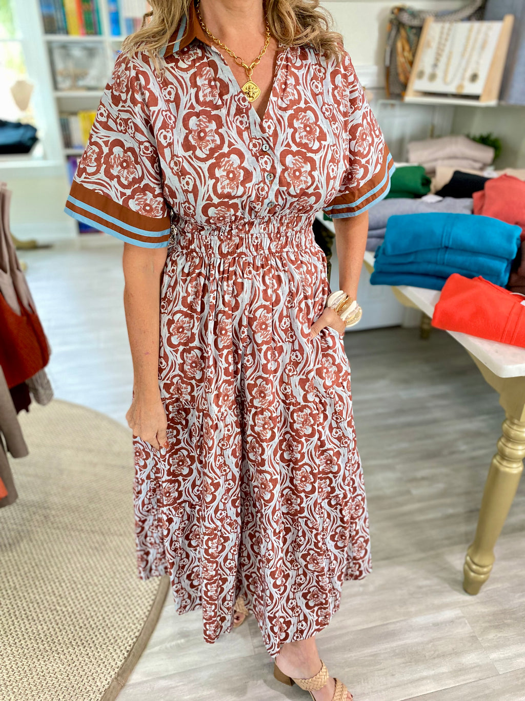 Diamond Floral Pattern Button Down Midi Dress