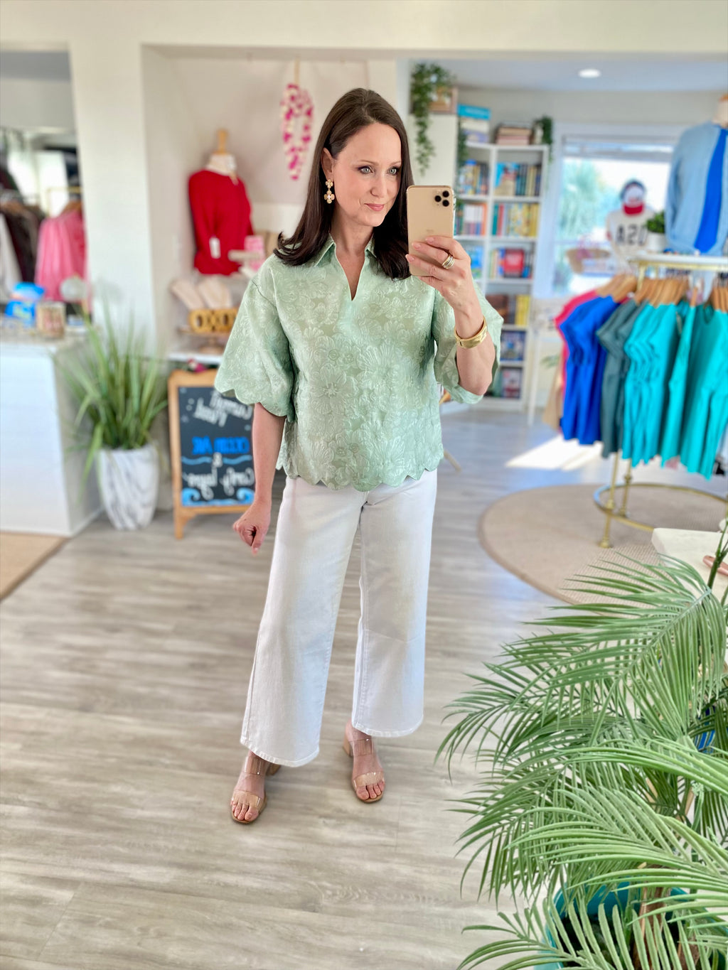 Drop Shoulder Floral Jacquard Top with Scallop Edge Detail