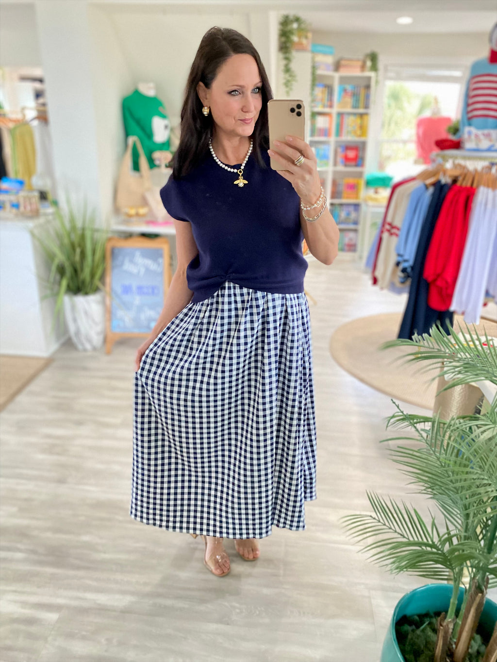 Layered Knit Top & Gingham Midi Dress Set