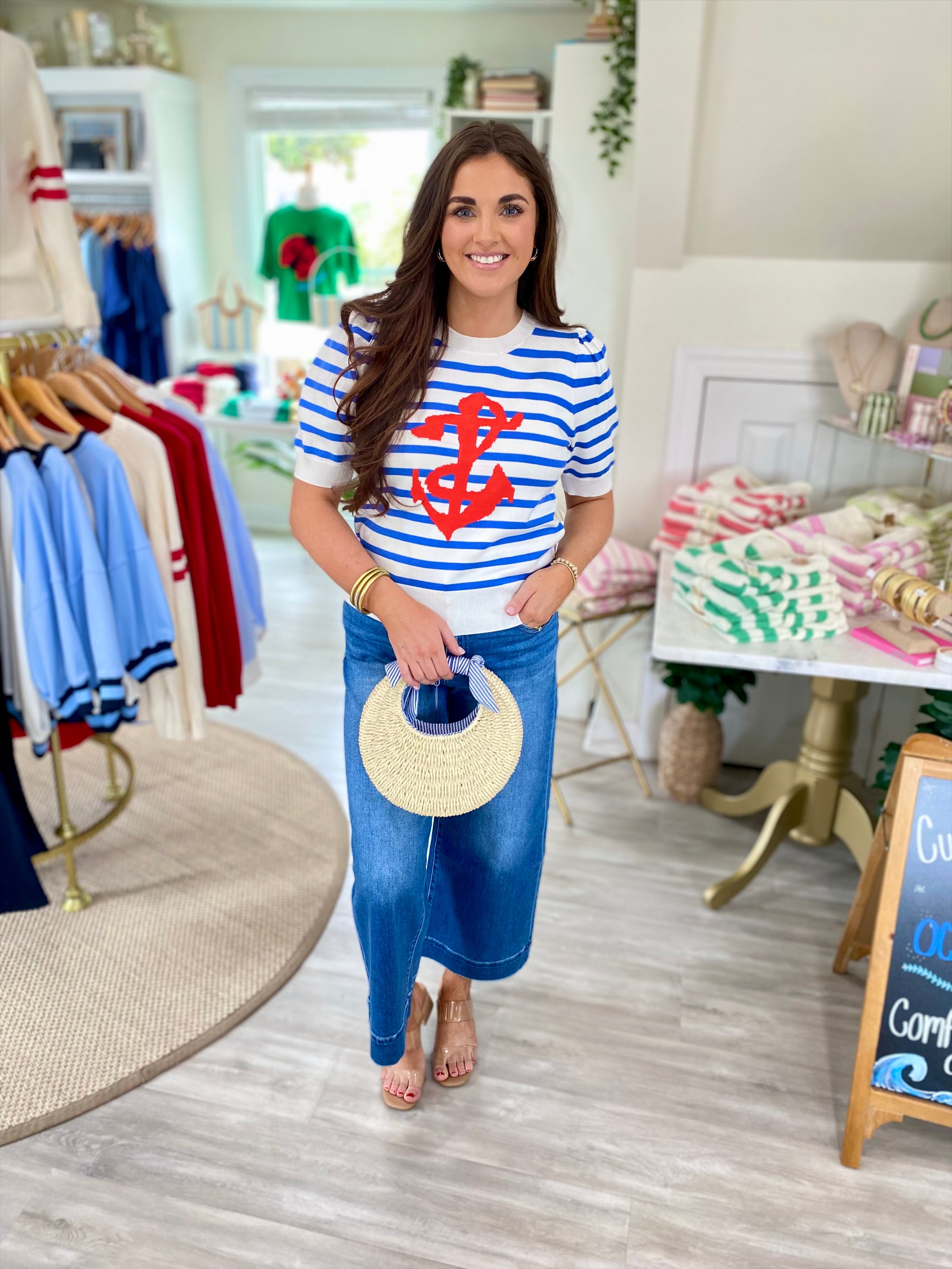 Classic stripes meet coastal charm in this effortless boutique favorite. Designed in a soft, lightweight sweater knit, this piece features a bold anchor graphic that makes just the right statement without feeling overdone.