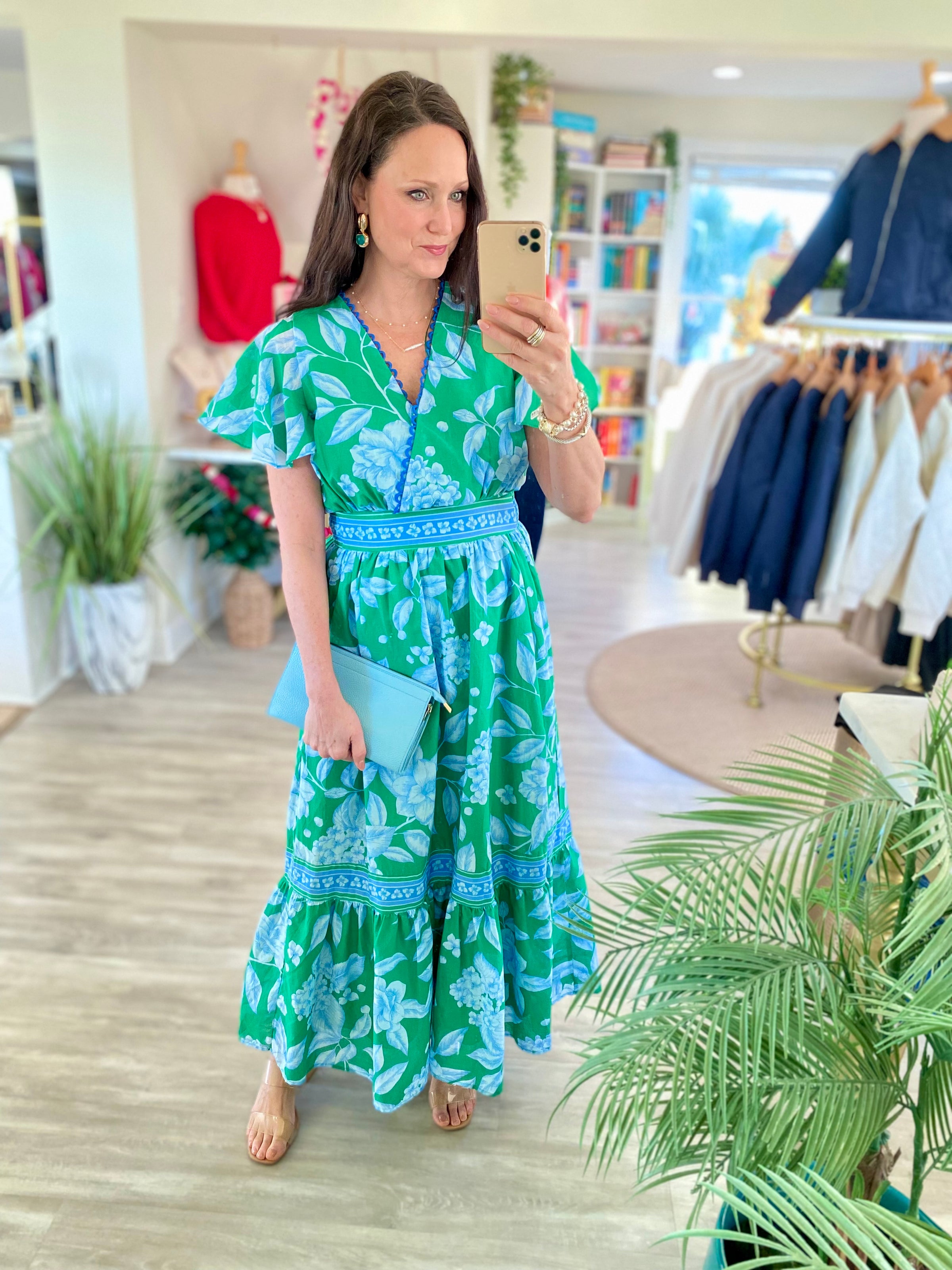 Turn heads in this stunning green and blue floral maxi dress, designed with a flattering wrap-style bodice and flutter sleeve. The flowy fabric moves beautifully, while the cinched waistband highlights your shape in all the right ways. Just add on heels for a cute look. - Floral - Maxi - Pockets - Surplice