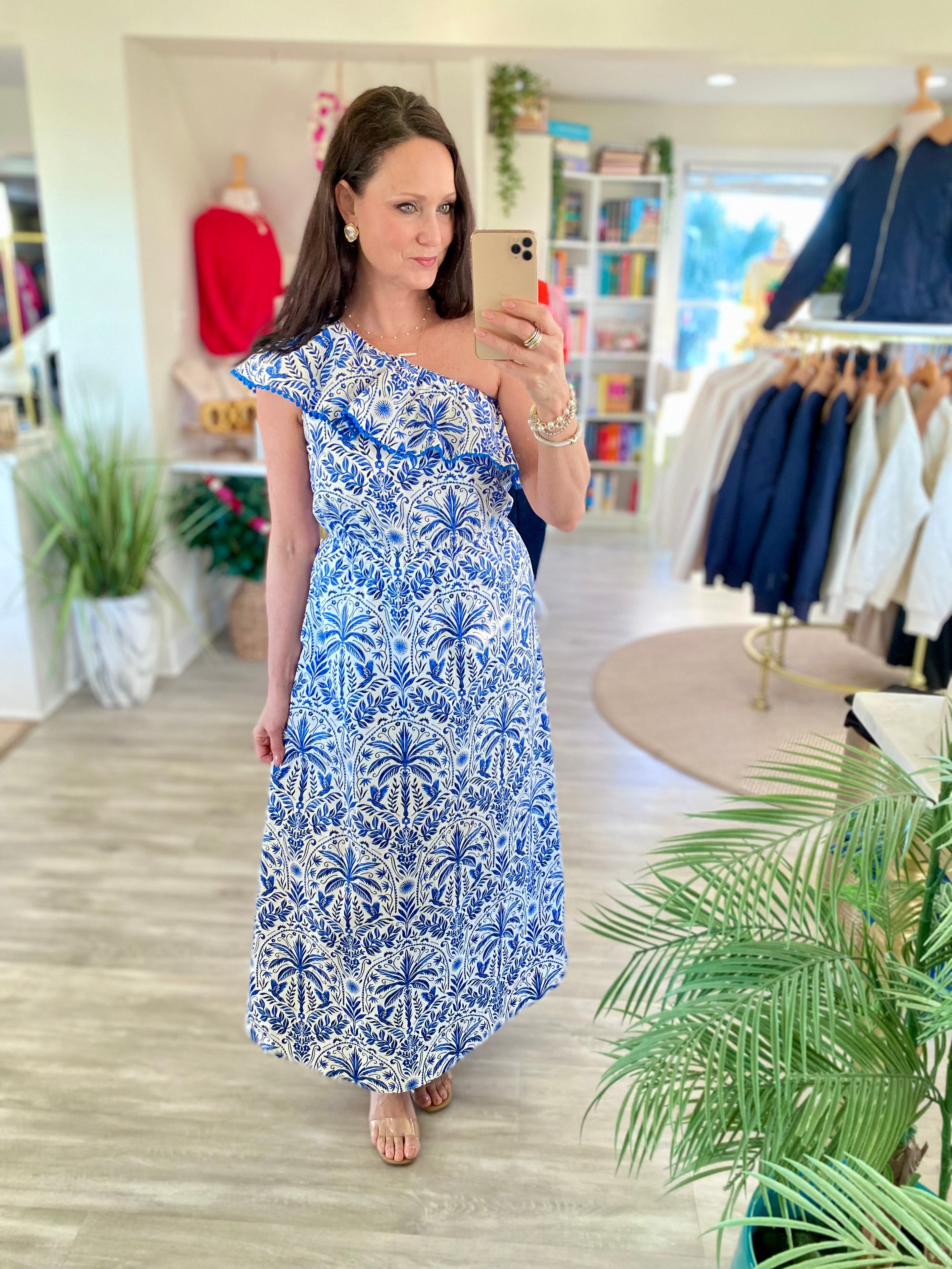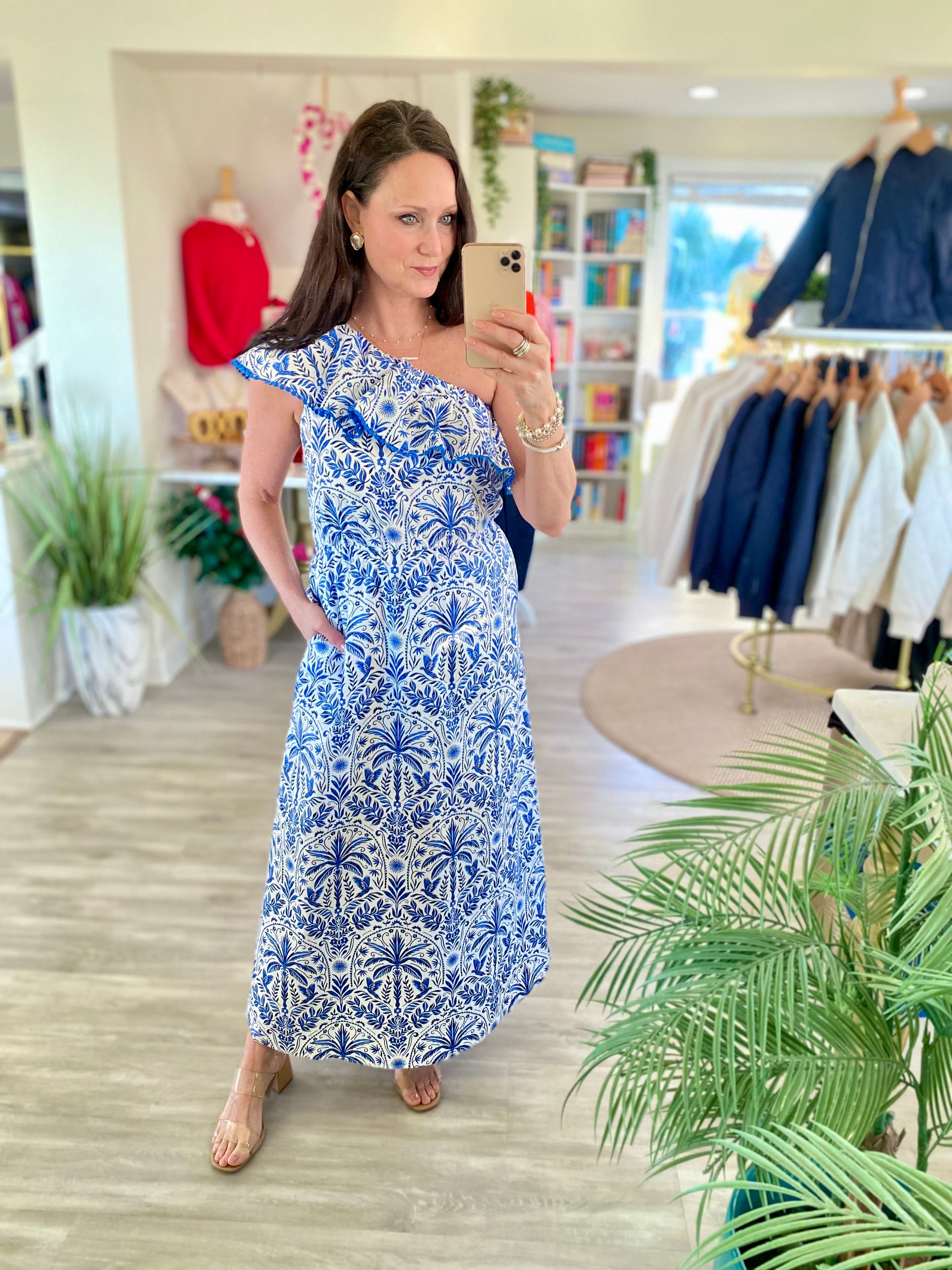 Twirl worthy and effortlessly chic. Perfect for any occasion, this dress features a ruffle one shoulder look. A stretchy elastic band at waist give it more comfort. Pair it with heels and a curly hairstyle for a cute look. - One shoulder - Floral - Cotton - Pockets -