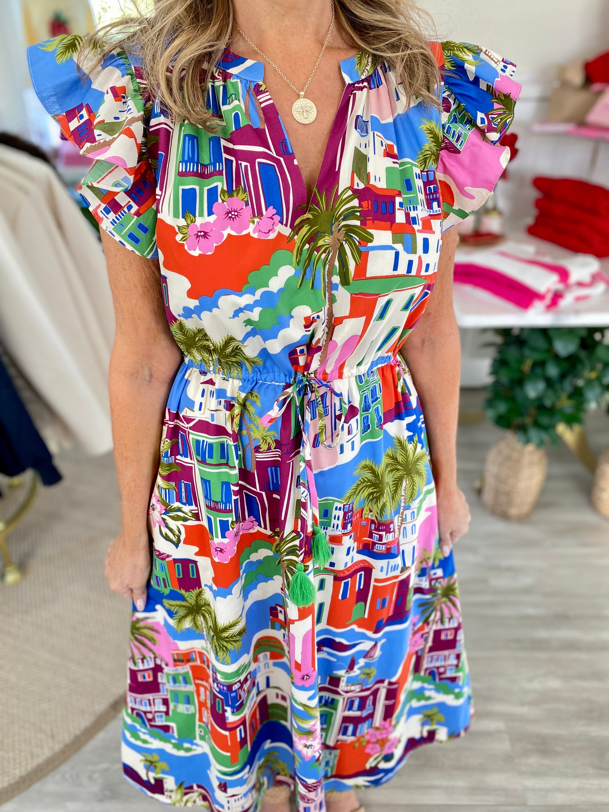 Let every step tell a story! An artsy print creates this adorable midi dress. Short ruffle sleeves frame a split neckline with a drawstring belt around the waist. Pair it with your favorite sandals or heels. - Midi - Split neck - Ruffle cap sleeves - Drawstring waist -