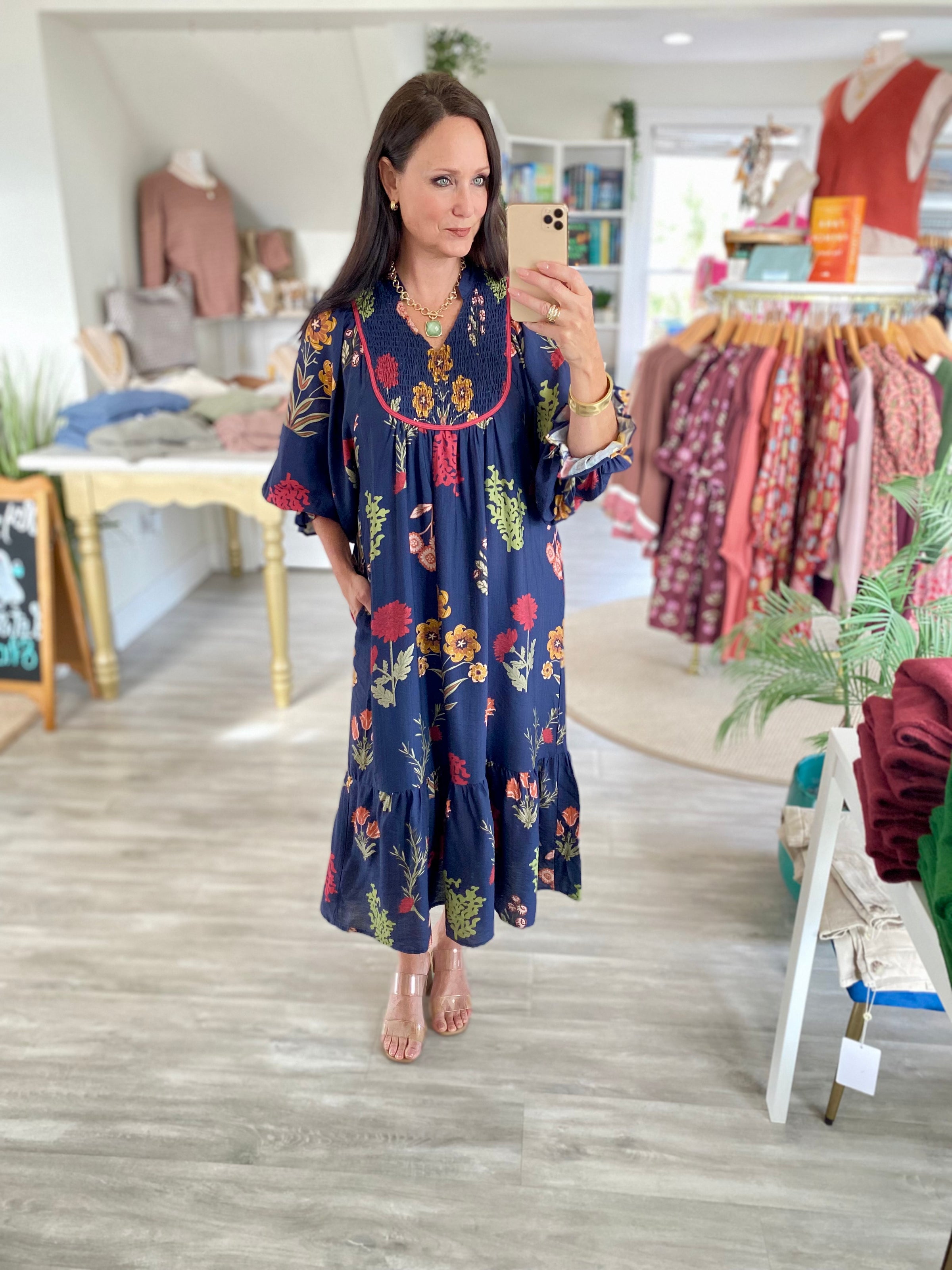 A statement piece with bohemian charm, this floral maxi dress is all about effortless elegance. Featuring a richly colored floral print on a navy background, the dress stands out with its smocked yoke and contrast piping detail. The relaxed fit, flowy tiered skirt, and fluttery ¾ sleeves make it perfect for transitioning through the seasons — equally lovely with sandals now or boots later.