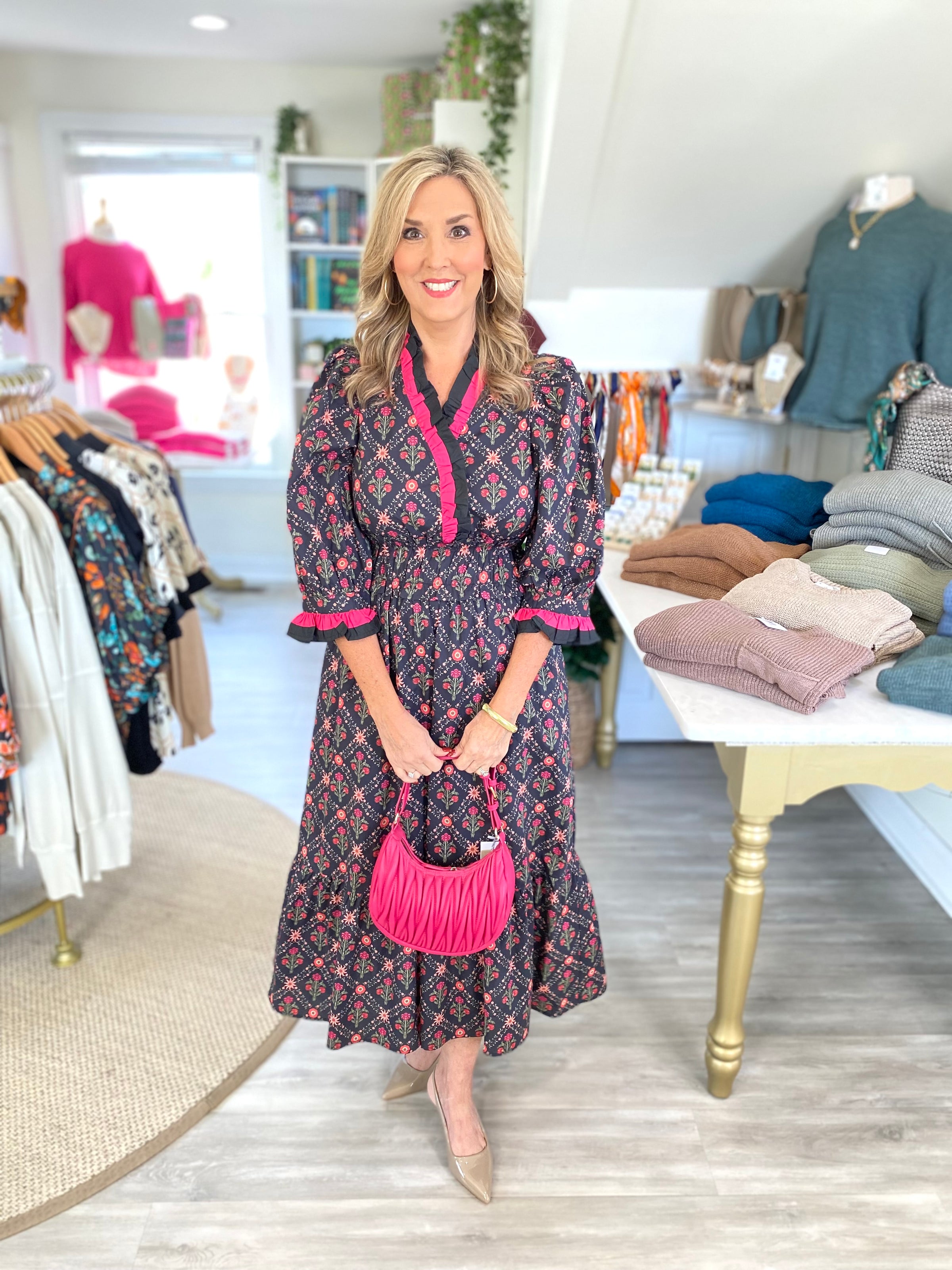 Romantic and refined, this floral print midi dress blends feminine charm with timeless ease. Designed with 3/4 puff sleeves and a ruffled V-neckline accented by contrast trim, it’s finished with a hidden button closure and a flattering elasticated empire waist. Side pockets add a practical touch, while the lightweight woven fabric and full lining ensure a graceful drape. Perfect for garden parties, luncheons, or a polished daytime look.