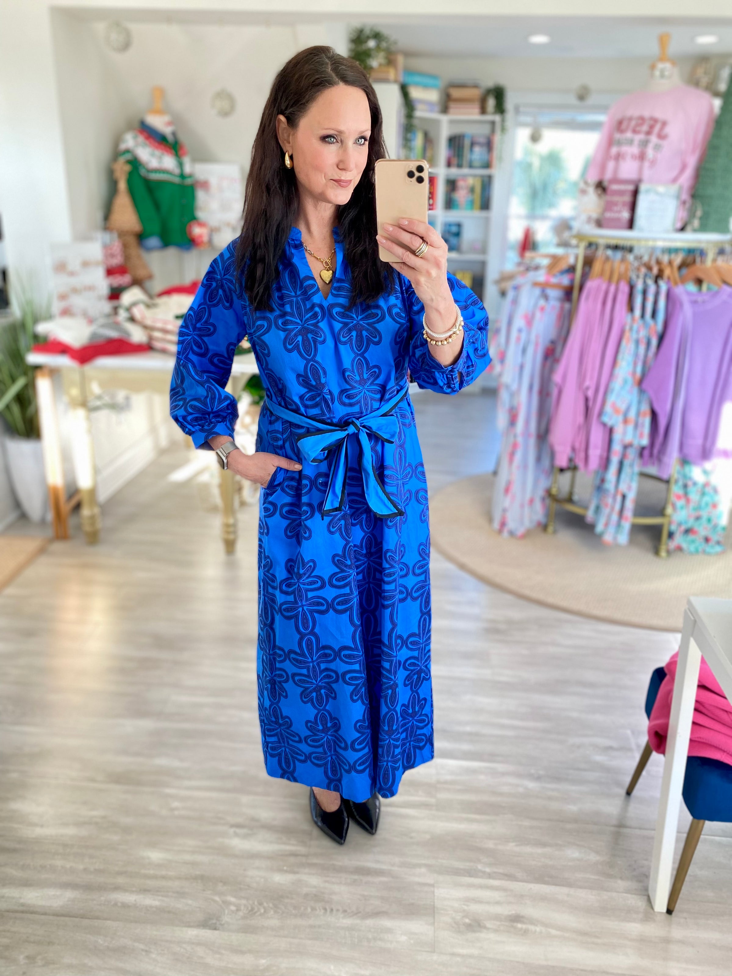 No matter what the occasion is, you can wear the Romery Abstract Terie V-Neck Midi Dress everywhere. A blue tonal abstract pattern decorates long sleeves frame a split neckline. It ends at the perfect mid length to be paired with heels. - Abstract - V-neck - Midi - Pockets