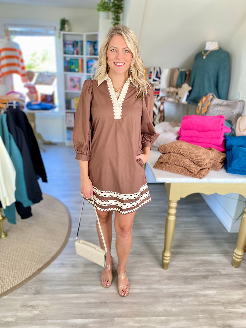 3/4 Sleeve Scalloped Trim Collared V Neck Mini Dress