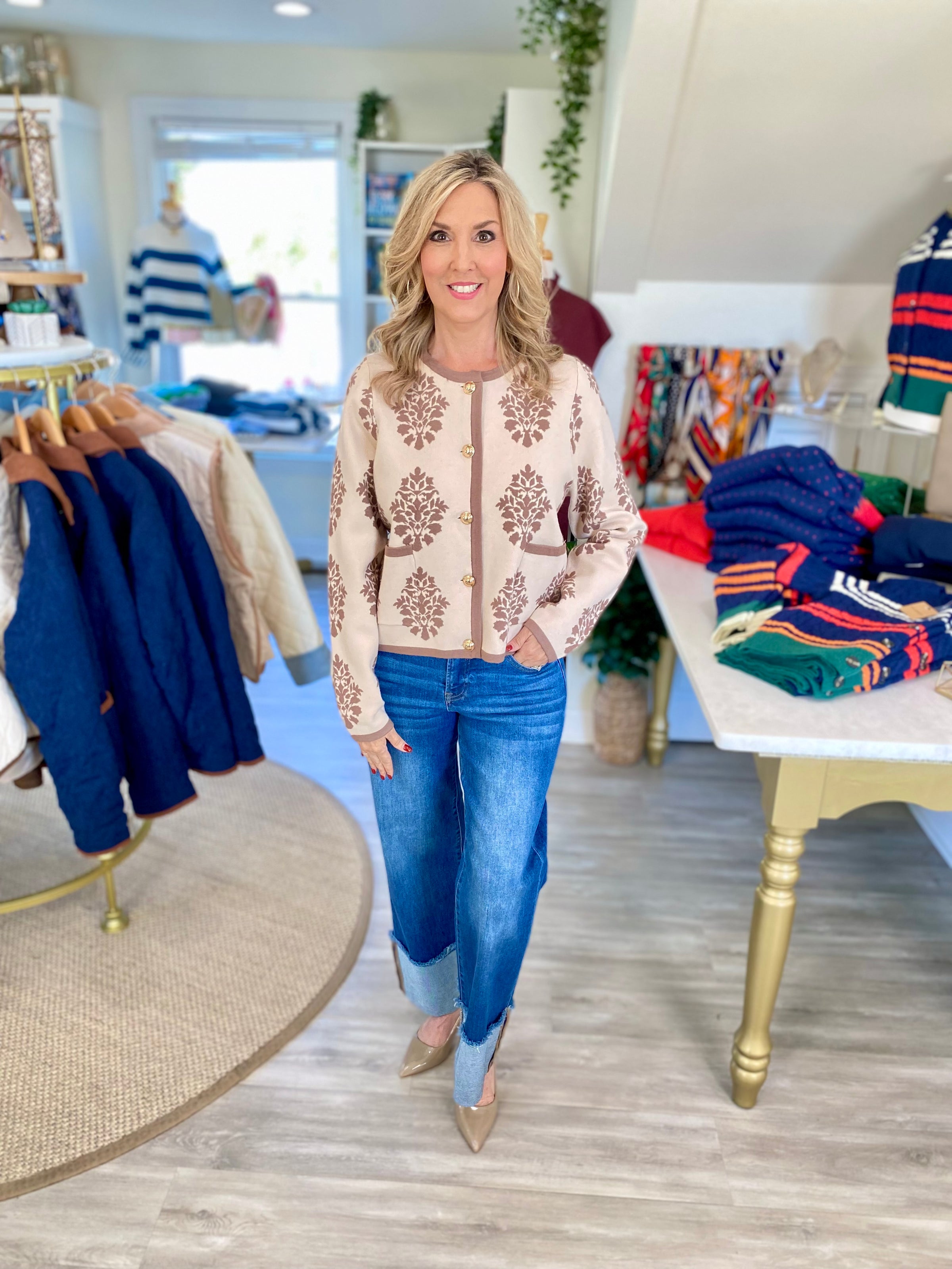 Classic elegance meets cozy sophistication in this beautifully knit cardigan. Featuring a timeless floral damask pattern, contrast trim, and front button closure, this piece brings effortless polish to any outfit. The patch pockets add a touch of practicality while maintaining its refined silhouette. Perfect for layering over blouses, turtlenecks, or dresses through the cooler months.