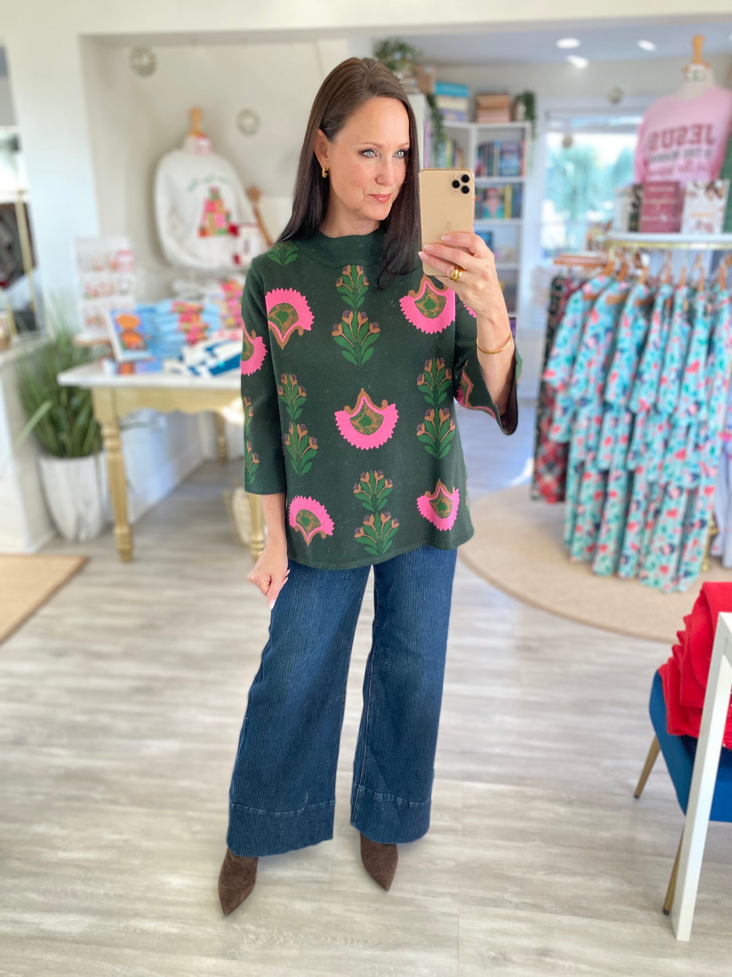 Floral Print Mock Neck 3/4 Sleeve Sweater