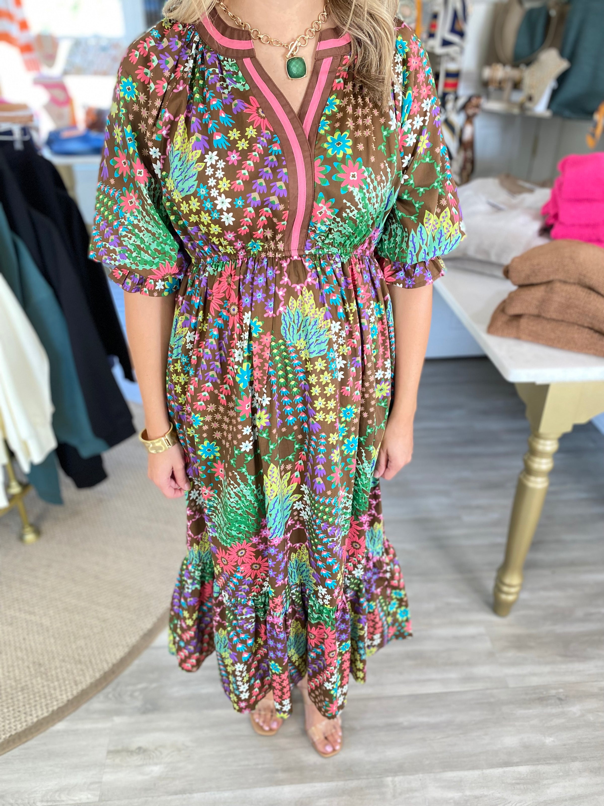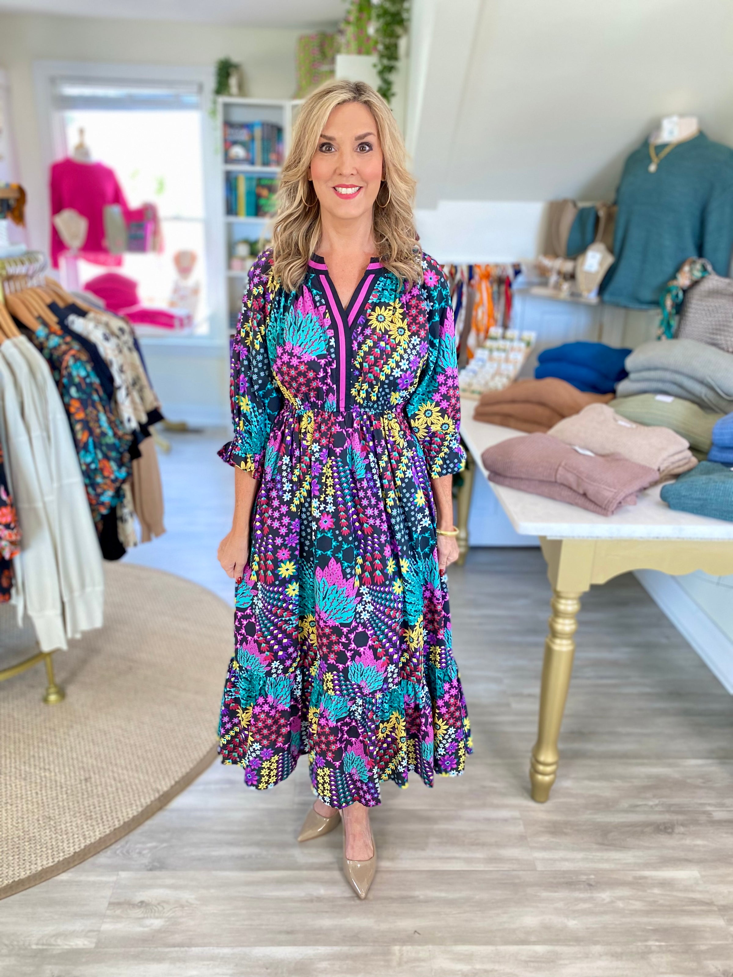 Bright, bold, and effortlessly feminine — this floral print midi dress is a true statement piece. Featuring a flattering V-neckline with contrast trim, an elastic waist for definition, and ruffled sleeves for a playful touch, this dress flows beautifully with every step. The vibrant floral print adds cheerful sophistication, perfect for any occasion from brunch to fall gatherings.