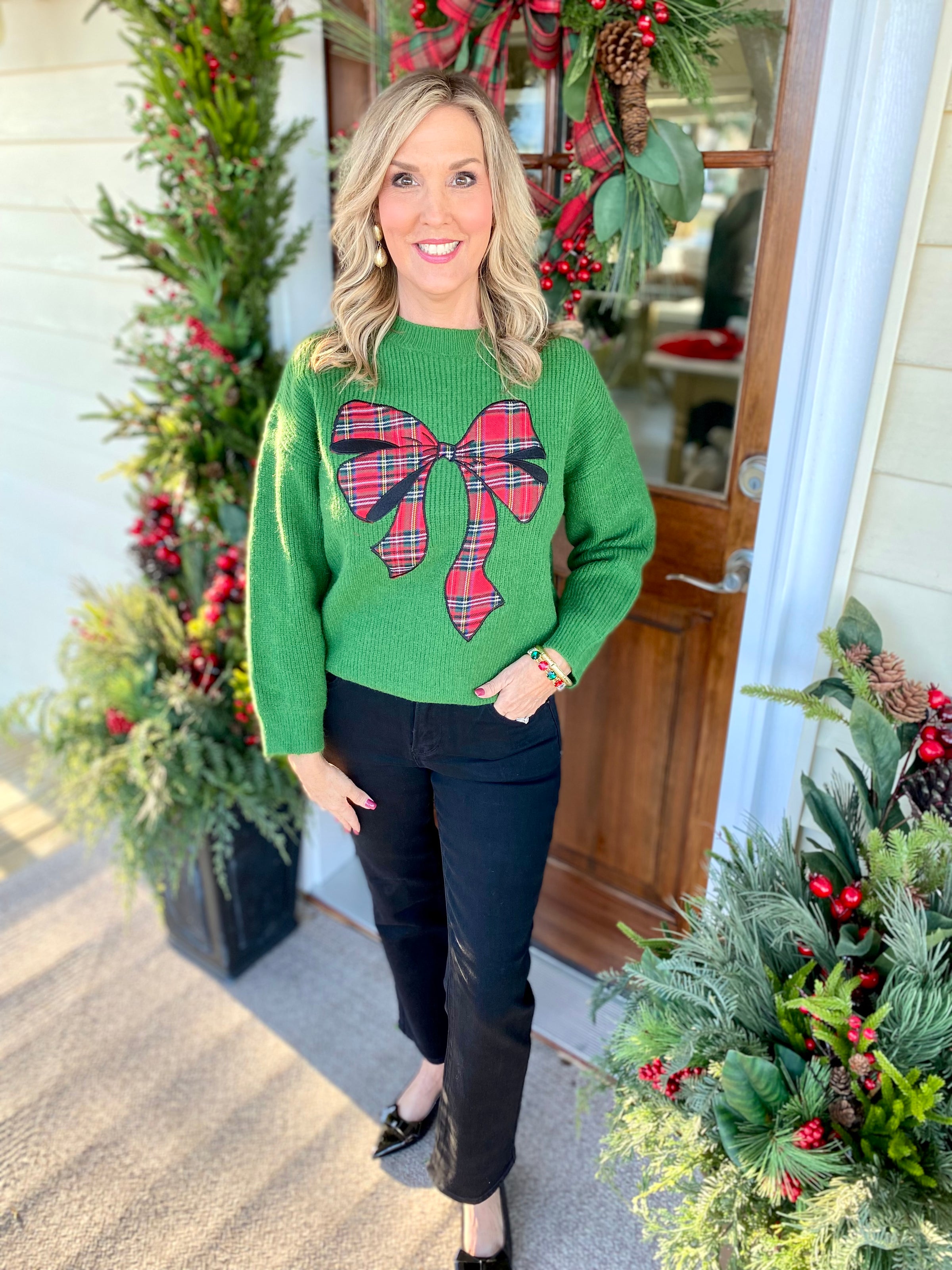 A festive standout for the season, this cozy holiday sweater features a bold plaid ribbon motif that adds instant cheer. The classic pullover silhouette offers a comfortable, easy fit, while the soft knit fabric keeps you warm without feeling heavy. Ribbed trim at the neckline, cuffs, and hem provides a polished finish.