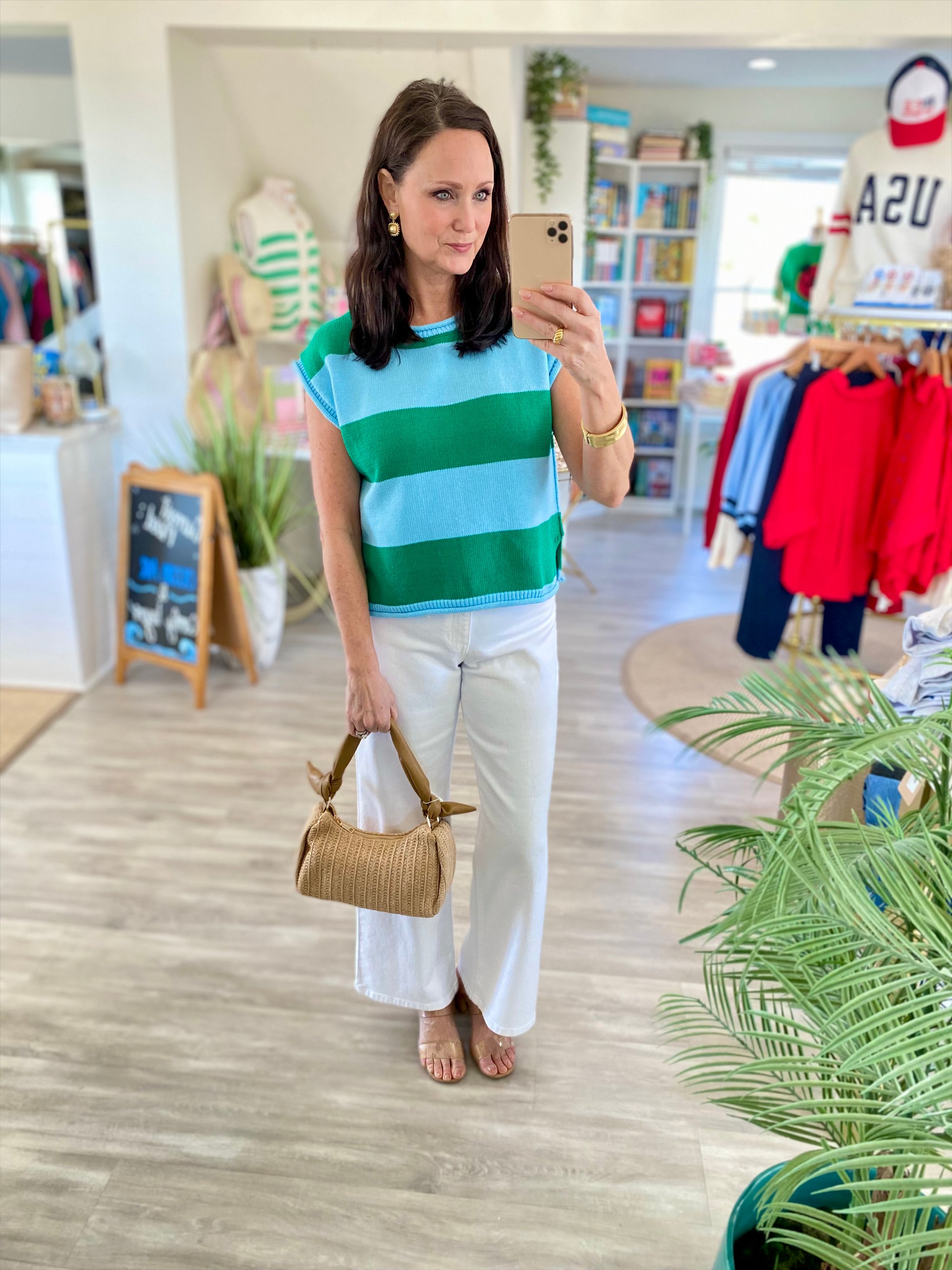 Bold, bright, and effortlessly polished — this stripe sweater vest is a fresh take on a classic silhouette. Designed with a relaxed crew neckline and modern cap sleeve shape, it delivers a flattering, easy fit that feels both comfortable and put-together.