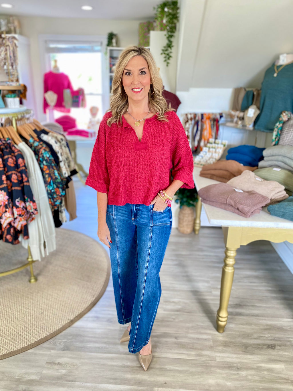 Chambray Collared 3/4 Tab Sleeve Button Down Shirt