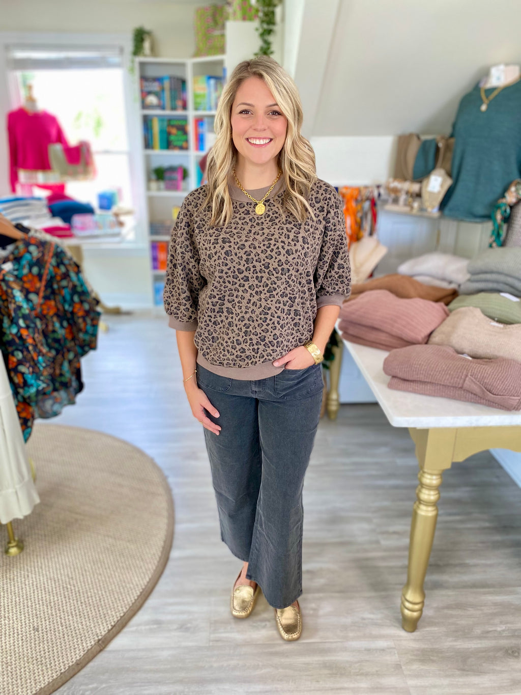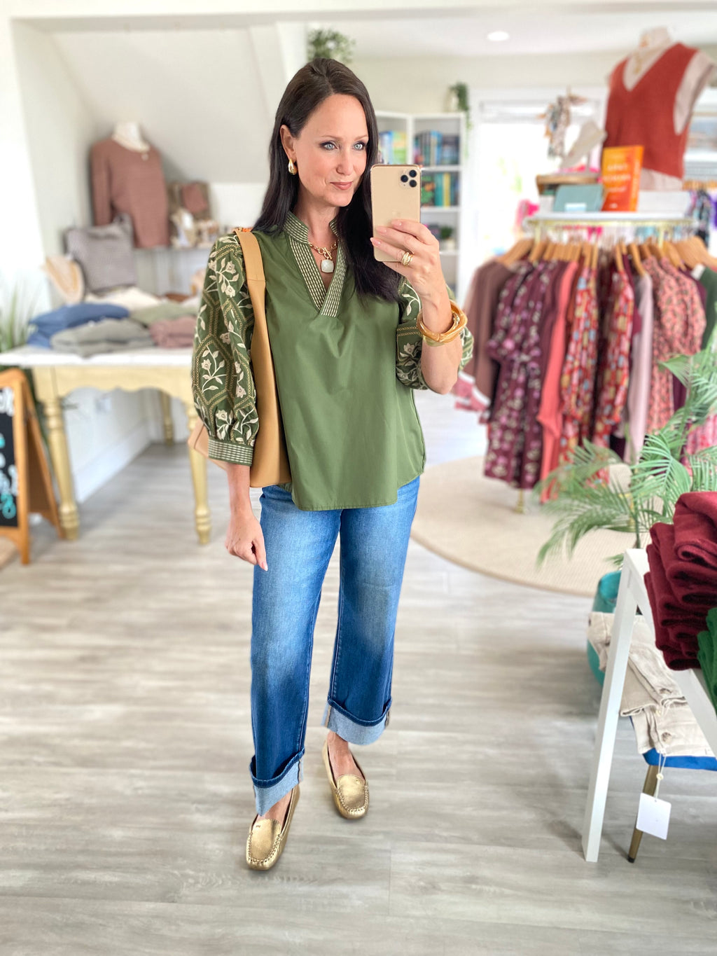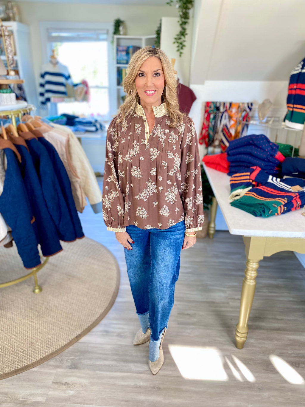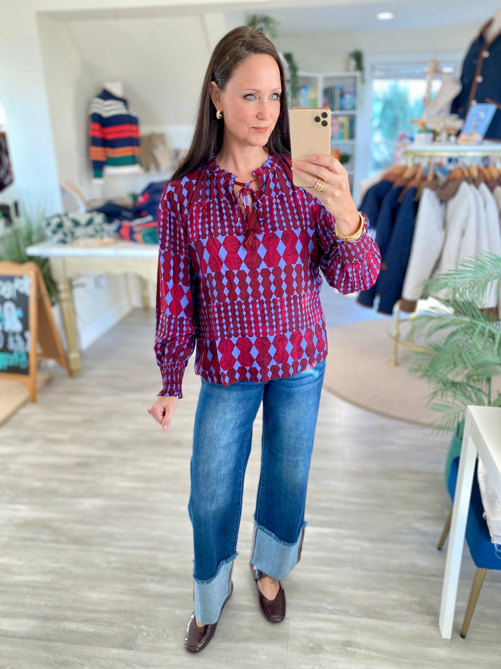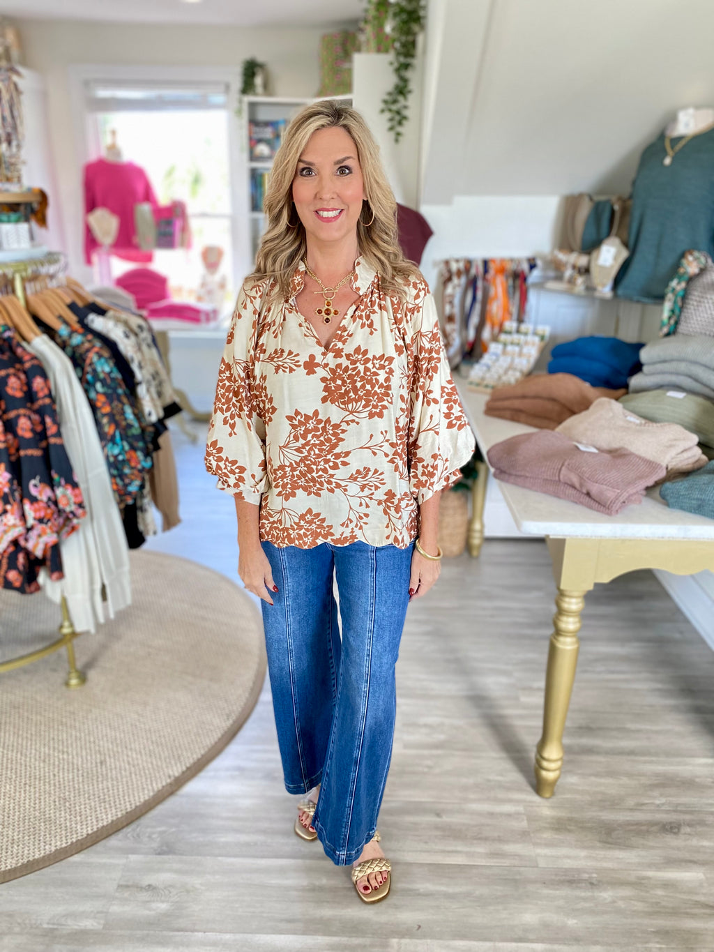 Floral And Paisley Grid Print 3/4 Sleeve Top