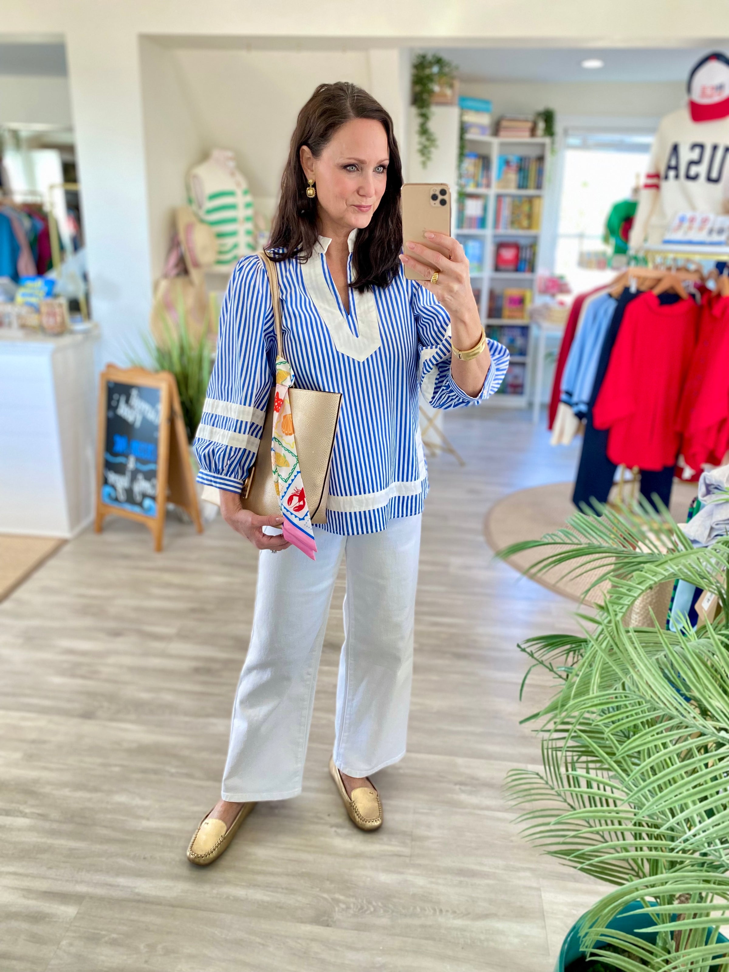 3/4 Puff Sleeve Stripe Top with Contrast Trim
