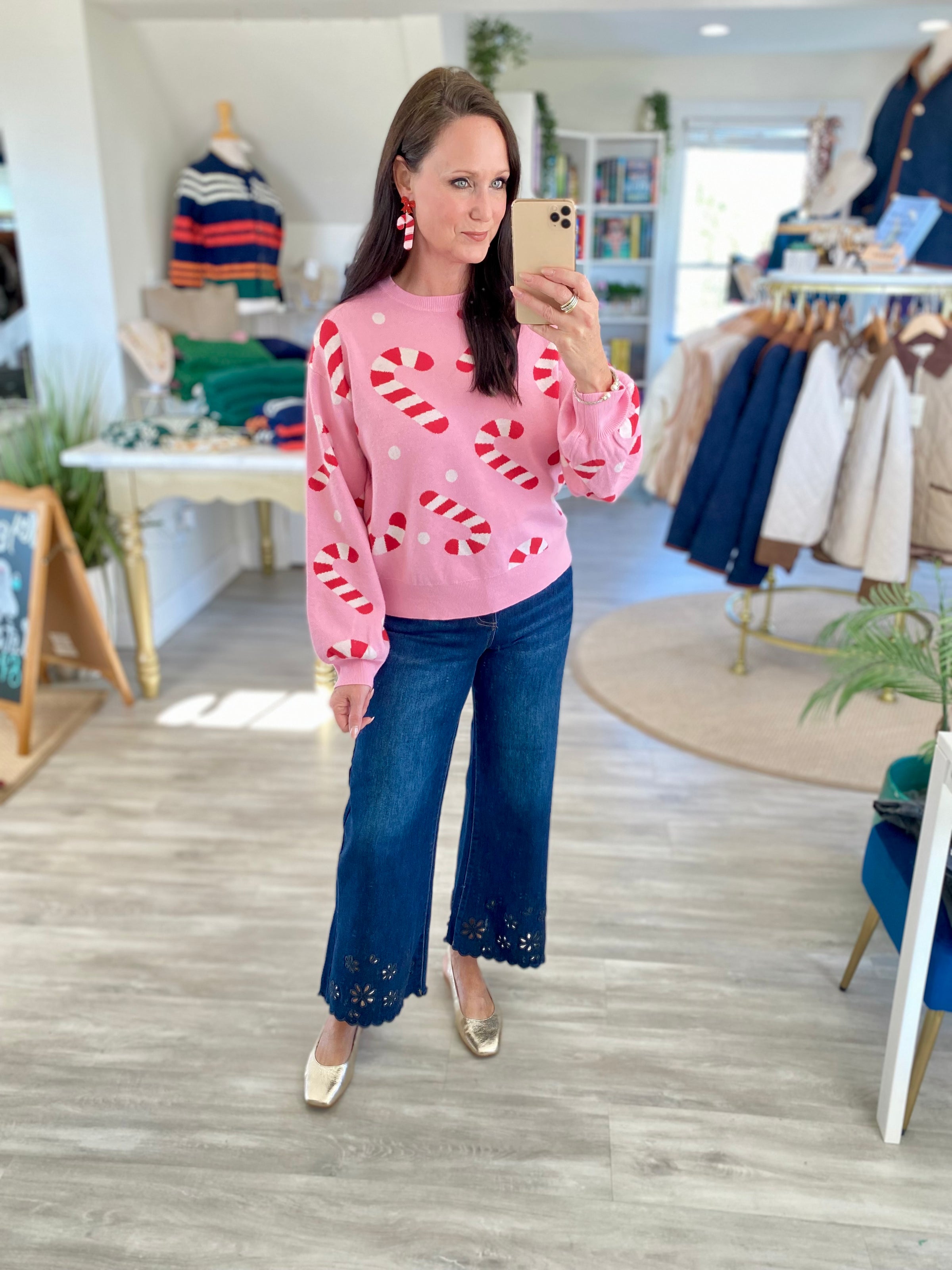 Sweet, festive, and full of holiday cheer! πŸ¬πŸ’– This pink pullover sweater is sprinkled with red-and-white candy cane motifs that instantly brighten your day. The soft knit, relaxed fit, and playful print make it perfect for holiday parties, cozy nights in, or just adding a little merry to your everyday look.