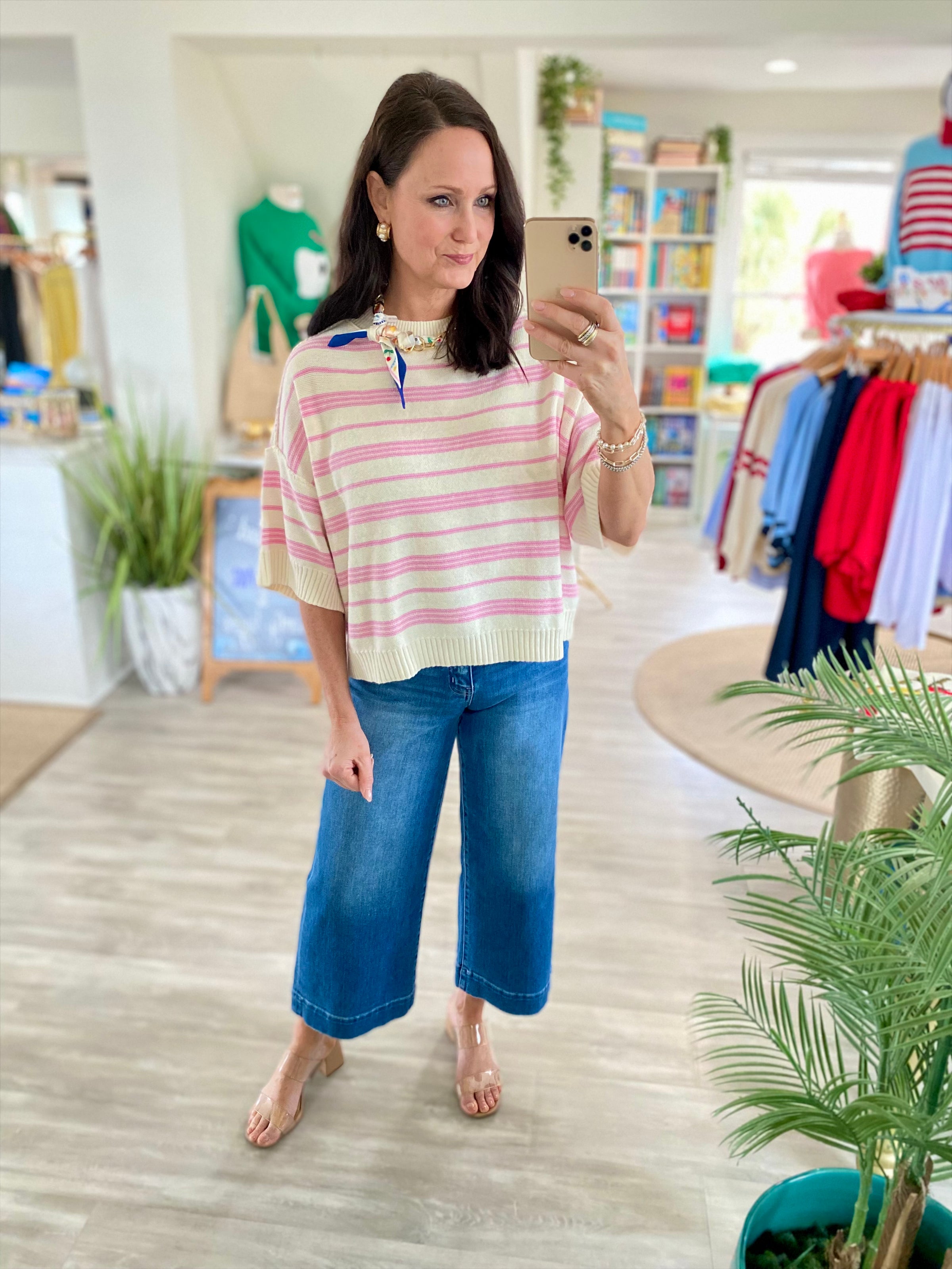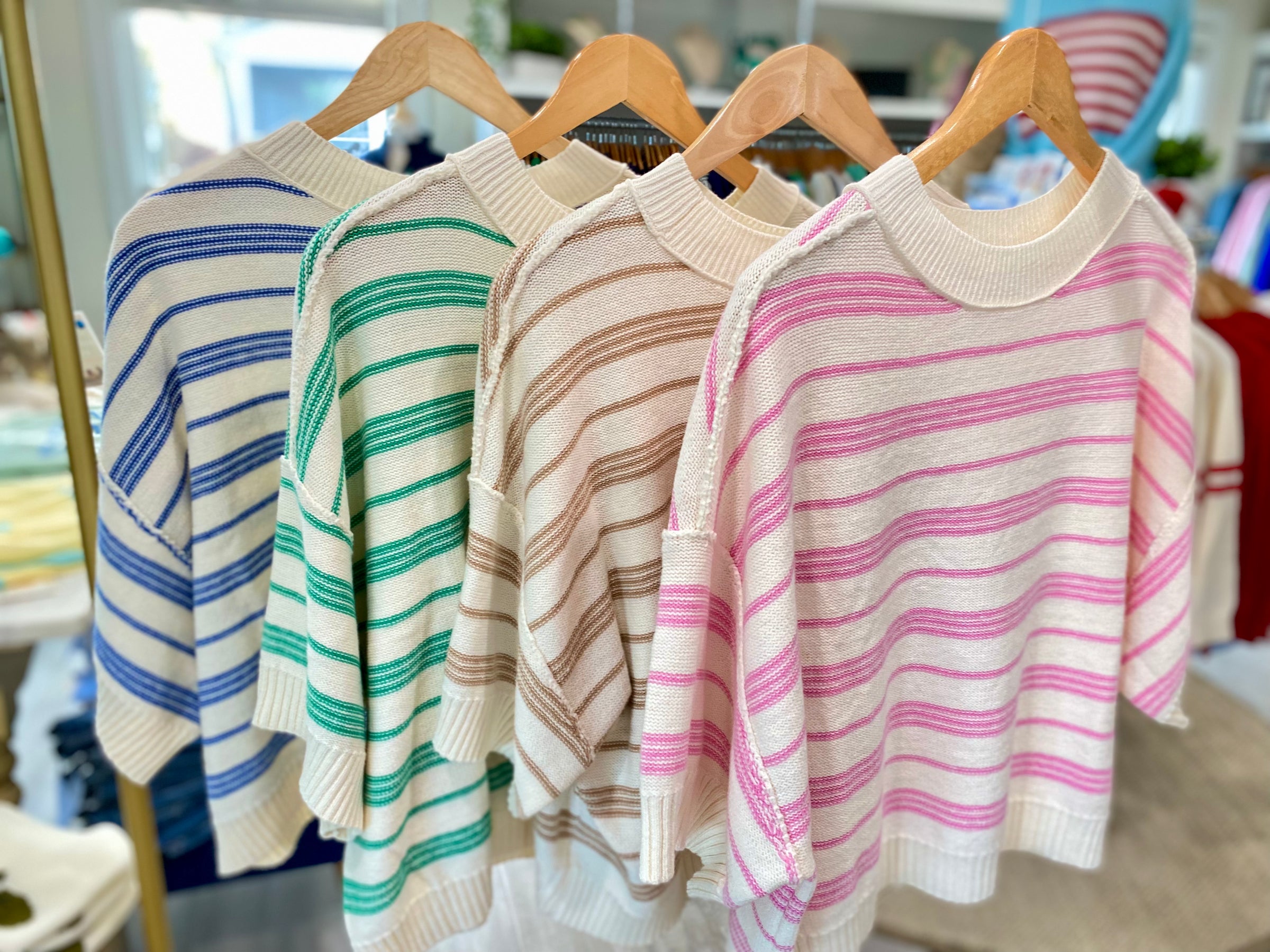 This lightweight knit sweater is an easy throw-on piece you’ll reach for all season. Designed with a relaxed drop shoulder fit and soft half sleeves, it features subtle stripe detailing for a fresh, laid-back look. Ribbed trim at the neckline, sleeves, and hem adds just enough structure while keeping things comfortable and casual. Perfect with jeans, shorts, or layered over a tank on cooler days.