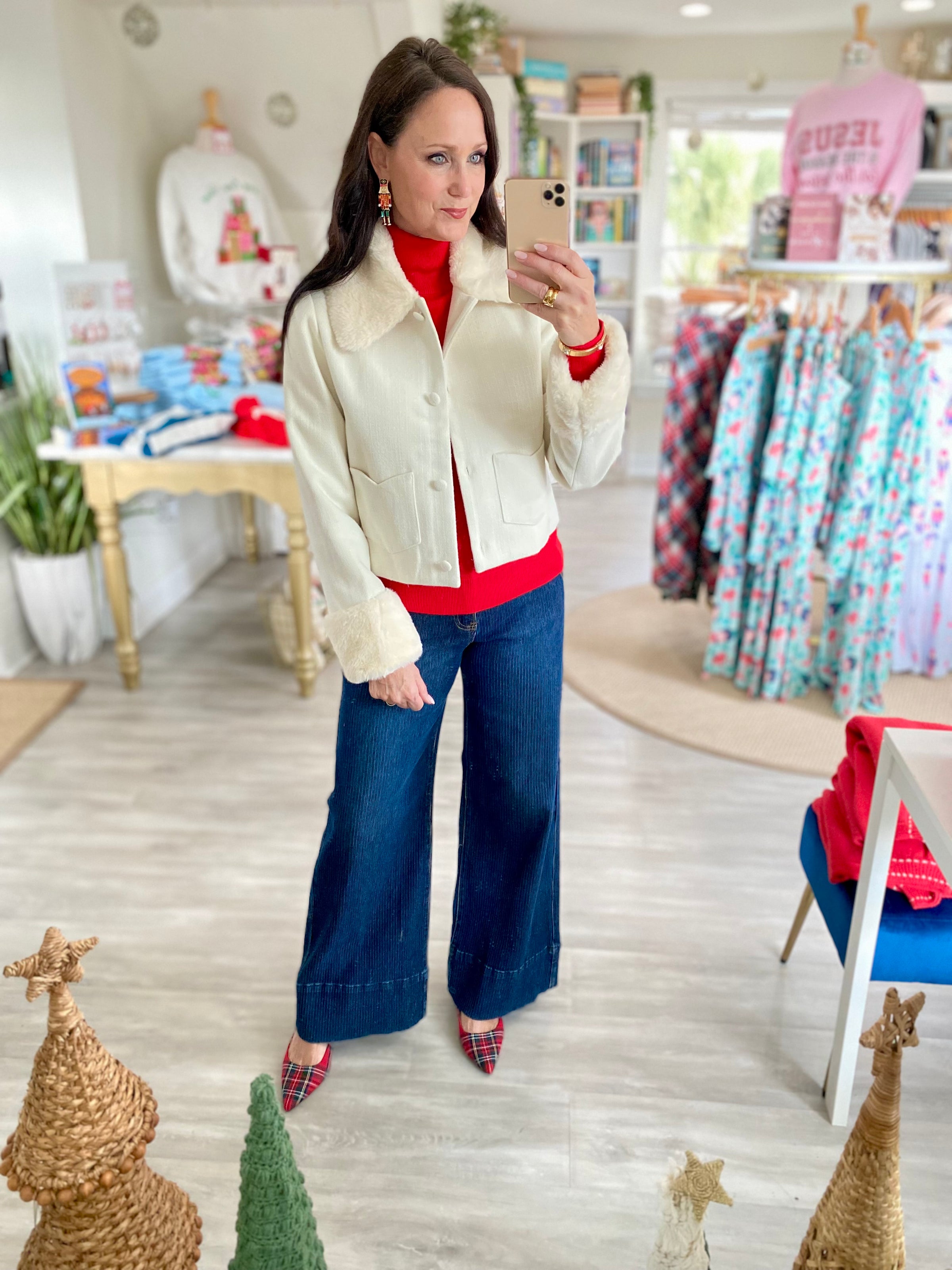 Elevate your winter style with this chic cropped jacket featuring a soft faux fur trim that adds the perfect touch of cozy sophistication. Designed with a structured silhouette and a classic button-front closure, it’s an effortless layer that pairs beautifully with sweaters, denim, and holiday looks alike. Front patch pockets offer both charm and functionality, while the faux fur accents at the collar and cuffs bring a luxe seasonal feel. Warm, stylish, and versatile — this is the statement jacket your cold-weather wardrobe needs.