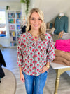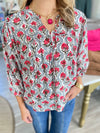 Fresh and feminine, this floral print blouse adds the perfect pop of color to your fall lineup. The soft woven fabric drapes beautifully, while the split neckline and front tie detail bring an effortless charm. Designed with 3/4 sleeves and elastic cuffs for a relaxed yet polished finish — easy to dress up or down.
