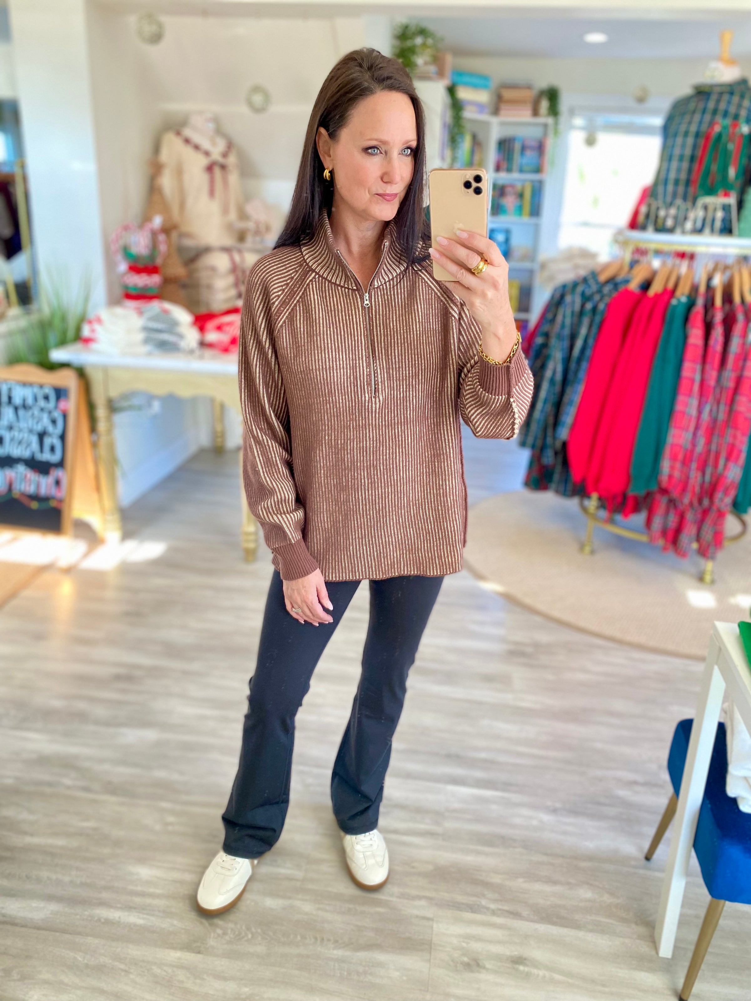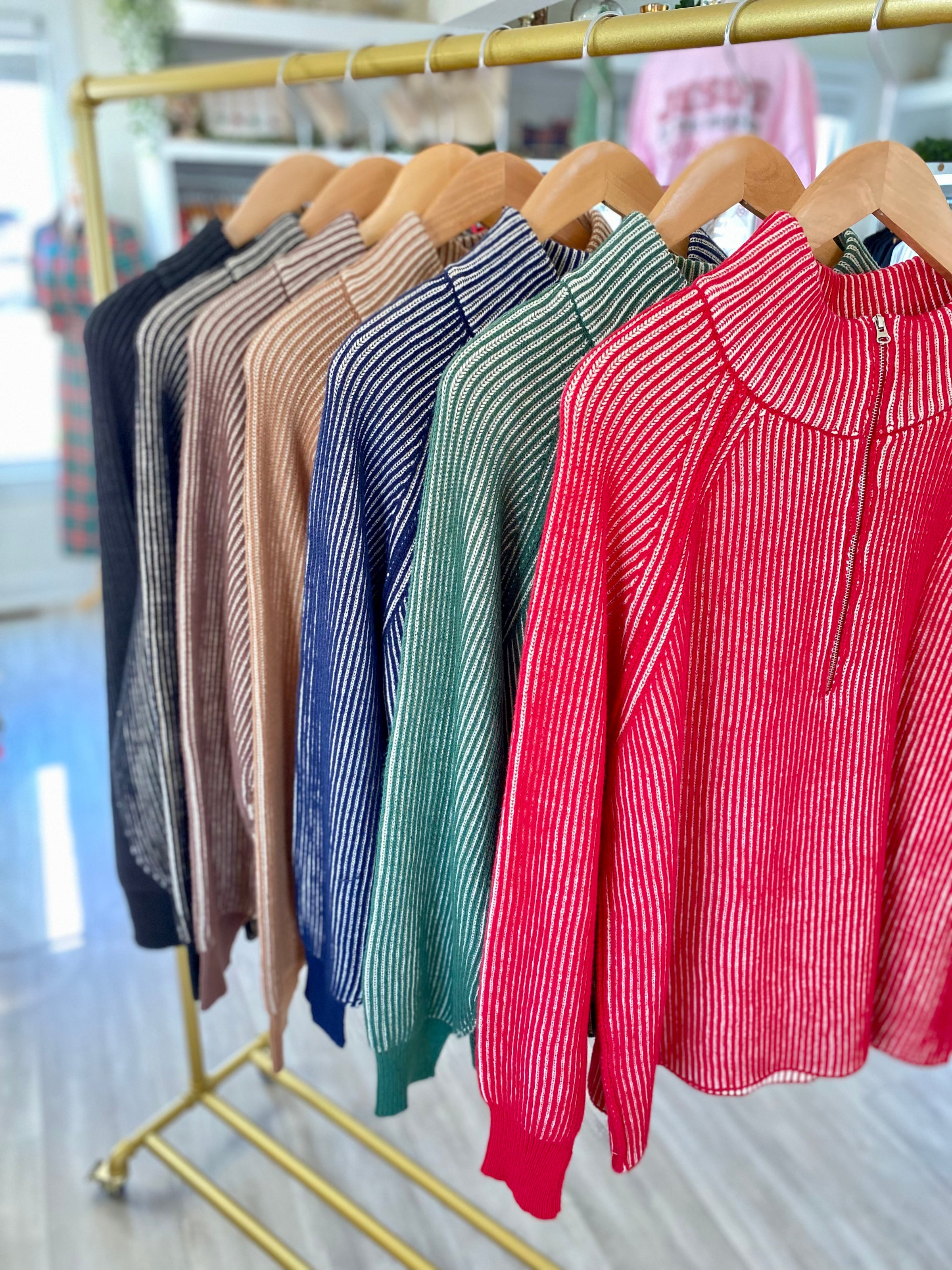 Cozy, sporty, and stylish — this ribbed half-zip sweater gives you the perfect elevated casual look. The two-tone knit adds subtle texture and dimension, while the mock neck and zip-front neckline let you wear it open or zipped up on chilly days. Relaxed through the body with a comfortable raglan sleeve, it pairs perfectly with denim, leggings, or joggers.