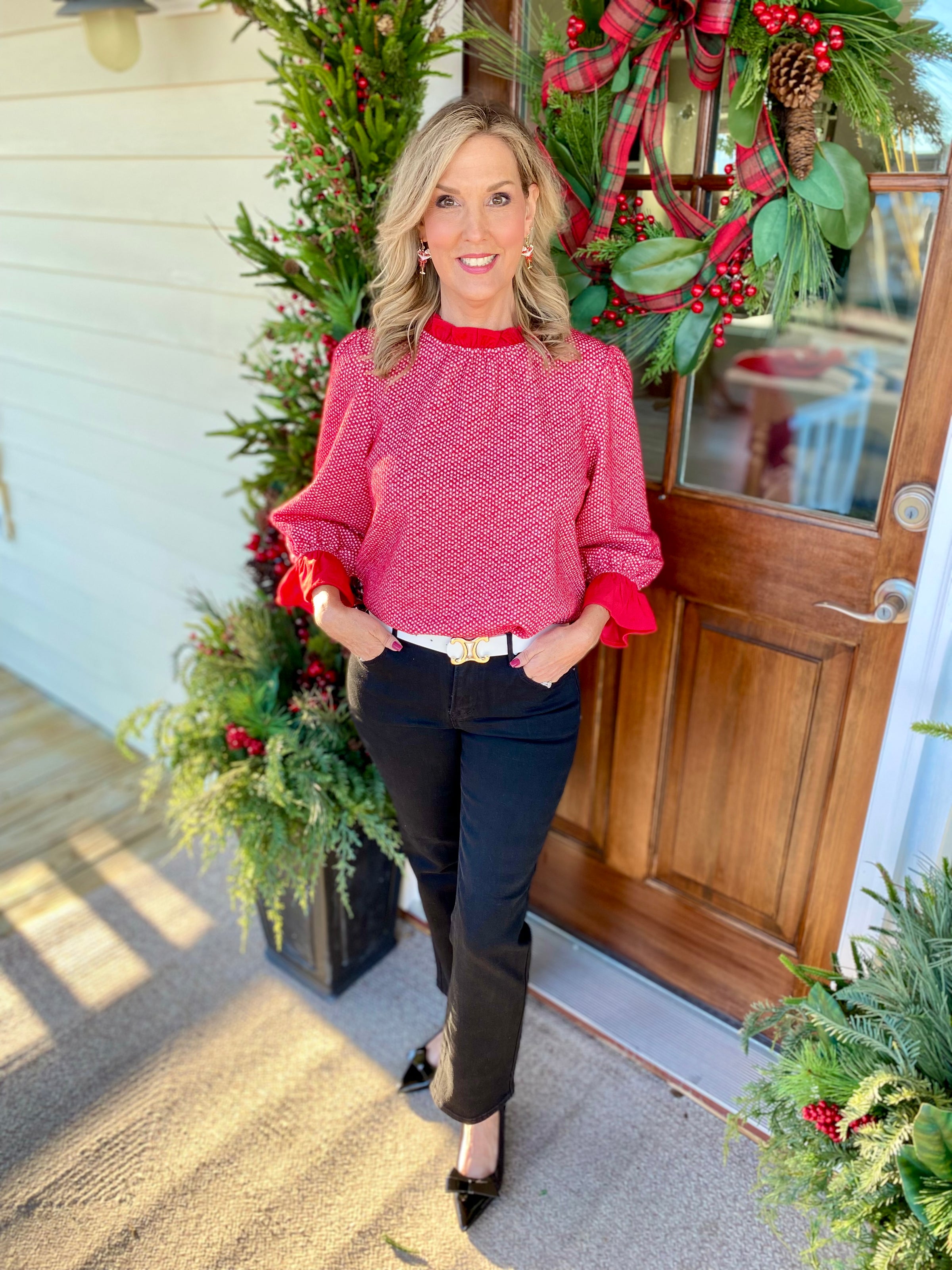 Bring a festive touch to your wardrobe with this charming sparkle knit top featuring a playful blend of texture and shine. Designed with a flattering ruffle neckline and coordinating ruffle cuffs, this piece adds just the right amount of feminine flair. The relaxed fit drapes beautifully, while the long sleeves create an effortlessly polished silhouette. Perfect for holiday gatherings, work events, or anytime you want to elevate your look with a hint of shimmer. Lightweight, comfortable, and easy to style—this top is a standout for the season.