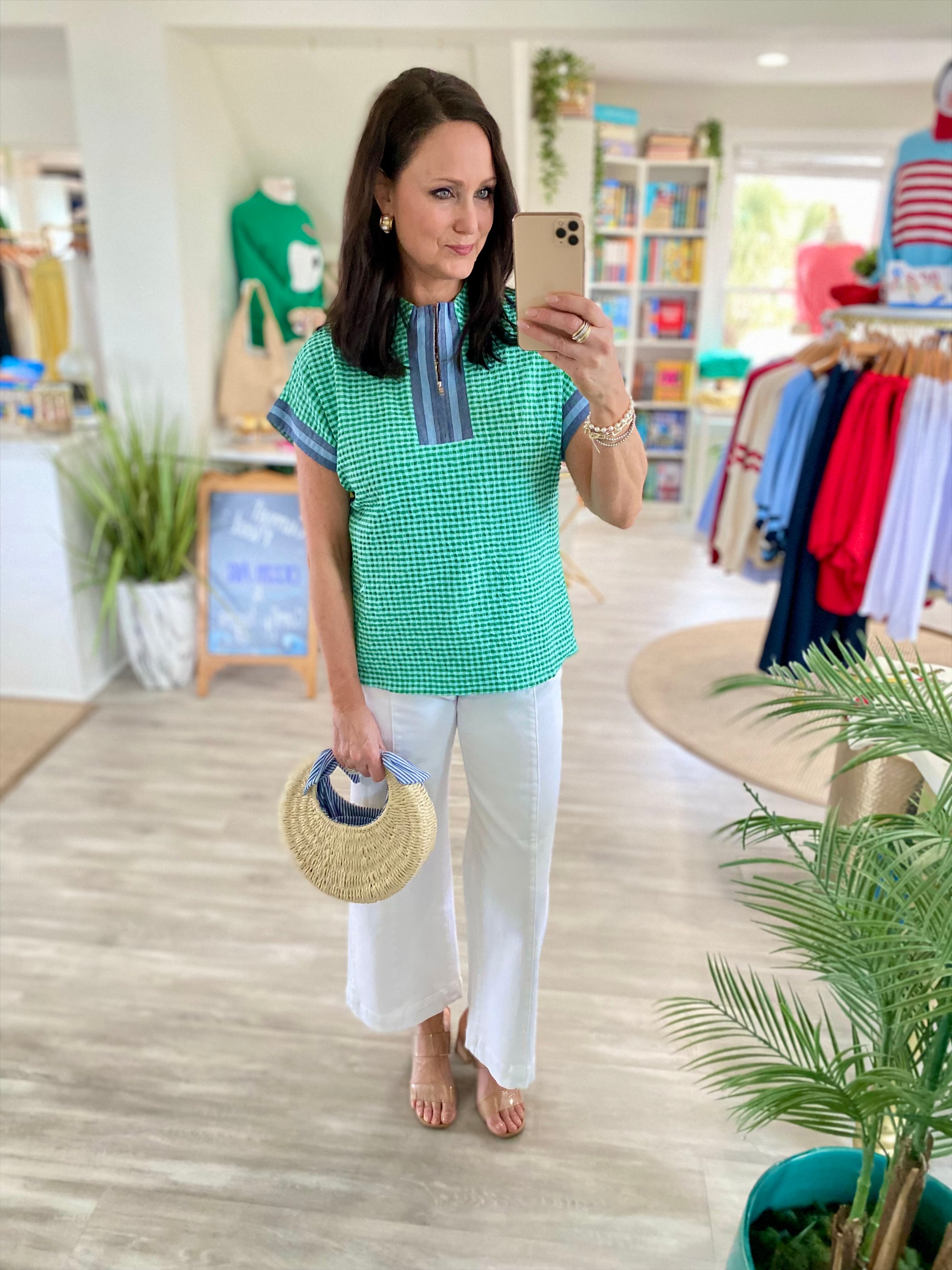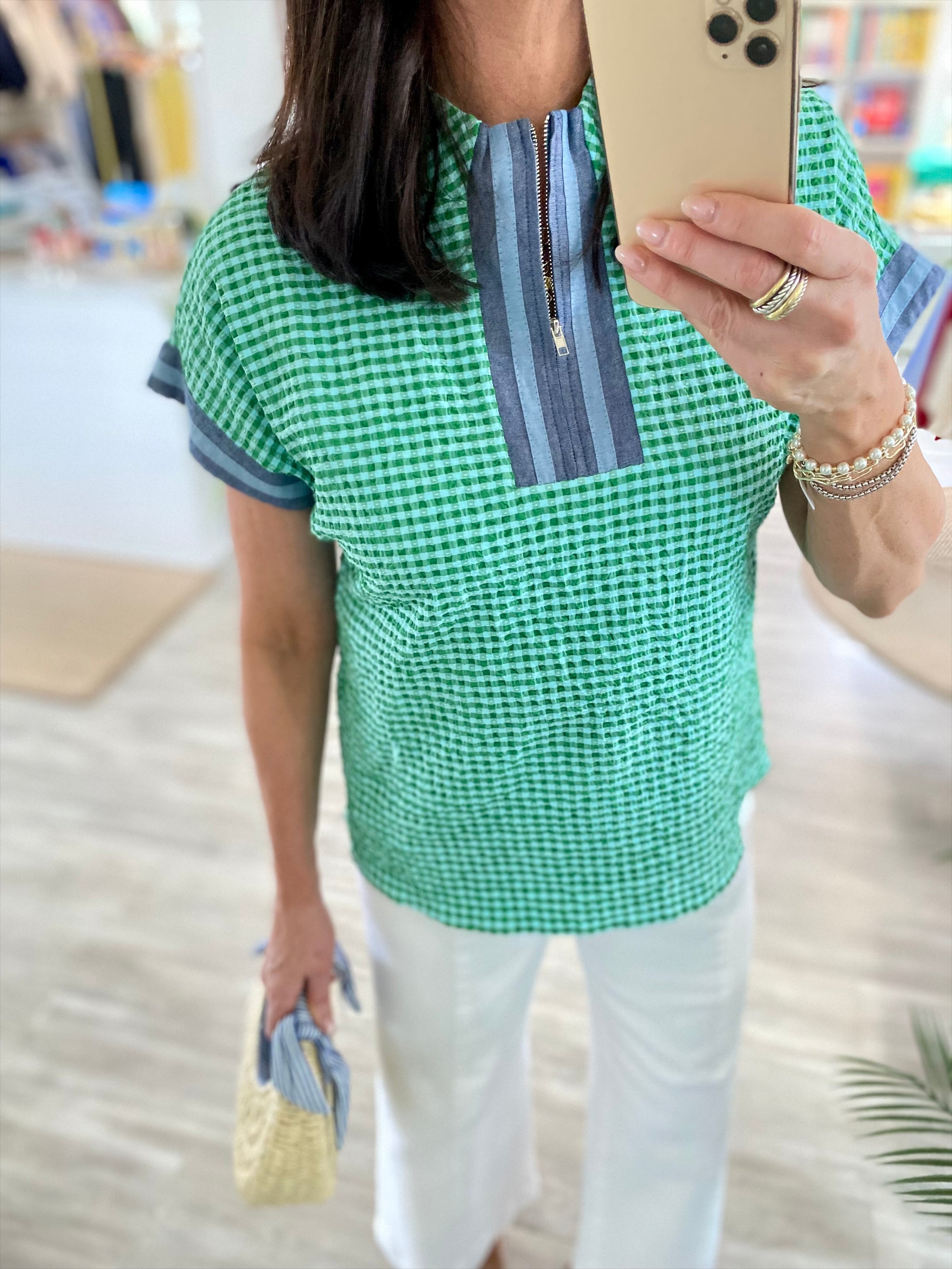 Sporty meets boutique charm in this crisp green gingham top. Designed with a textured seersucker-style fabric and modern contrast details, it’s the perfect blend of polished and casual. Easy to wear and effortlessly flattering, this top adds a fresh pop of pattern to your everyday wardrobe.