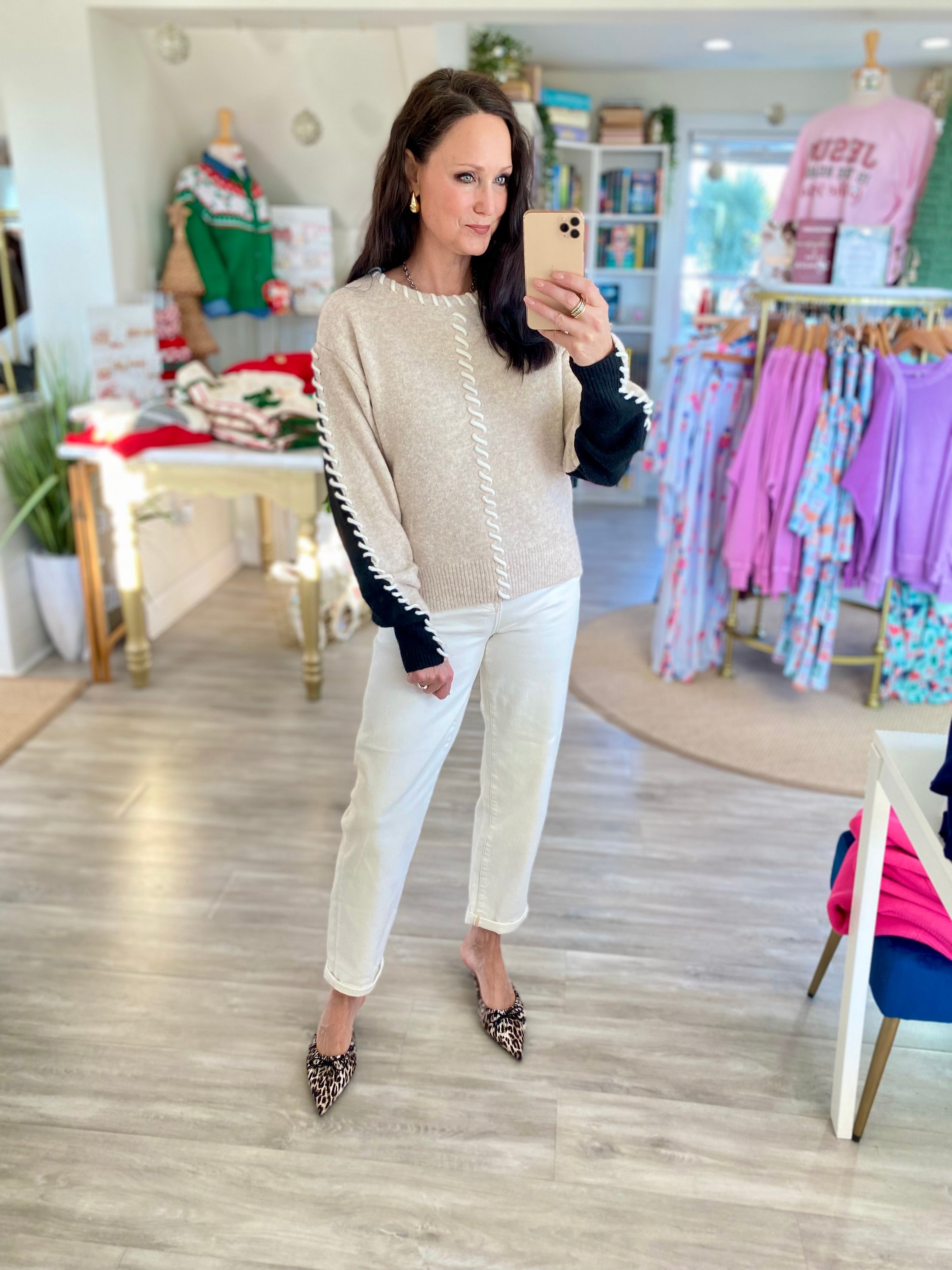 Perfect with denim, white jeans, or faux leather pants. Comfy for every day, cute enough for a lunch date or casual holiday gathering.